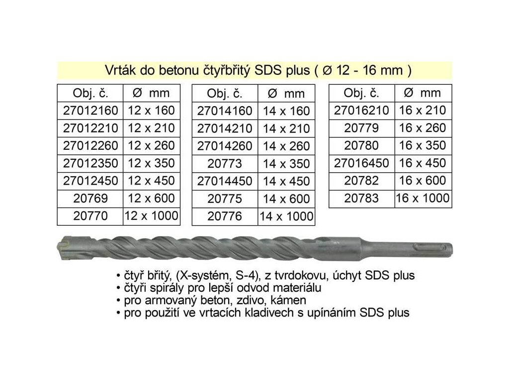 Čtyřbřitý vrták do betonu 14 x 450 mm ( X-systém, S-4 ) pro použití ve vrtacích kladivech s upínáním SDS plus. pro armovaný beton, zdivo kámen a další.