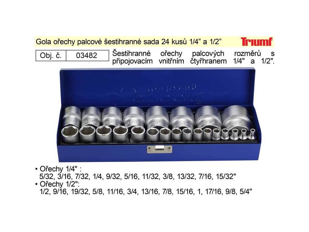 Šestihranné ořechy sada 24 kusů palcových rozměrů s připojovacím vnitřním čtyřhranem 1/4" a 1/2". Vrobeno z kvalitní chromvanadiové slitiny oceli CrV.