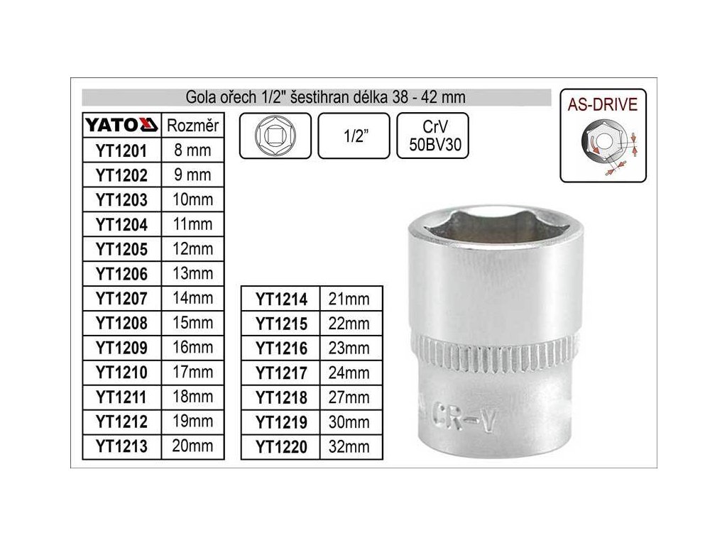 Nástavec šestihranný 1/2" (12,5mm) vyroben z kvalitní chromvanadiové slitiny oceli CrV 50BV30 a splňující normu DIN 3121 s celkovou délka 38mm. Funkce AS-DRIVE umožňuje vyvinout větší kontaktní sílu, neboť ke kontaktu se šroubem nedochází na hranách šestihranu, nýbrž v první třetině styčných ploch. Tím nedochází k poničení hlavice šroubu a ořech mnohdy povolí i matice a šrouby již poničené.