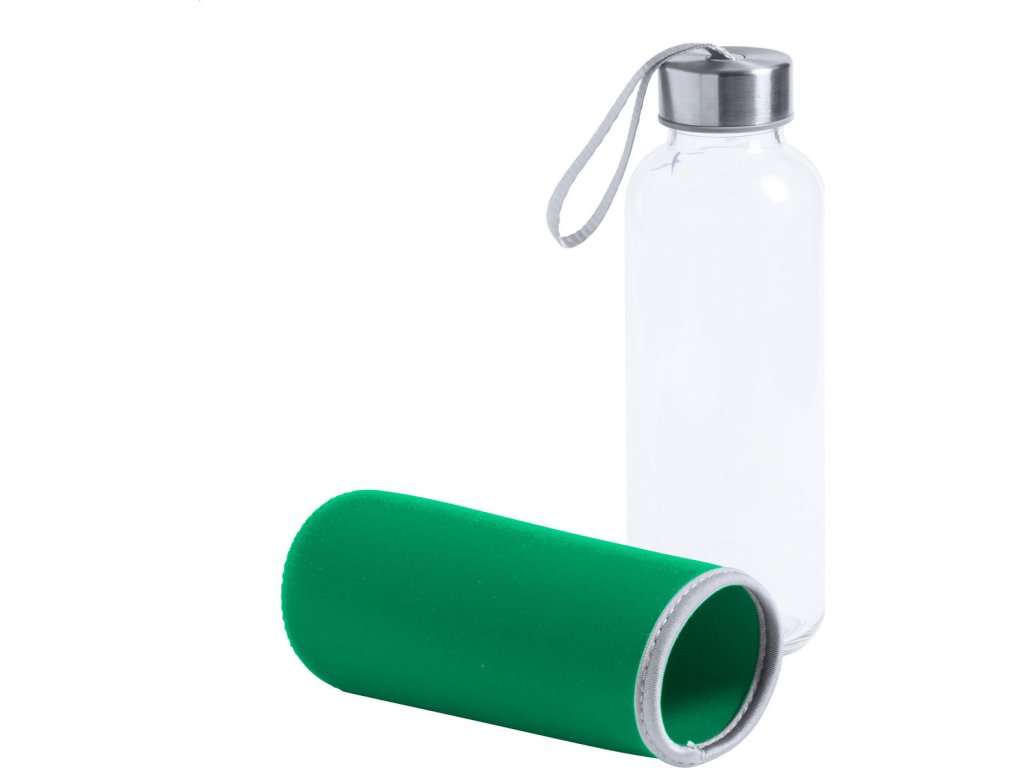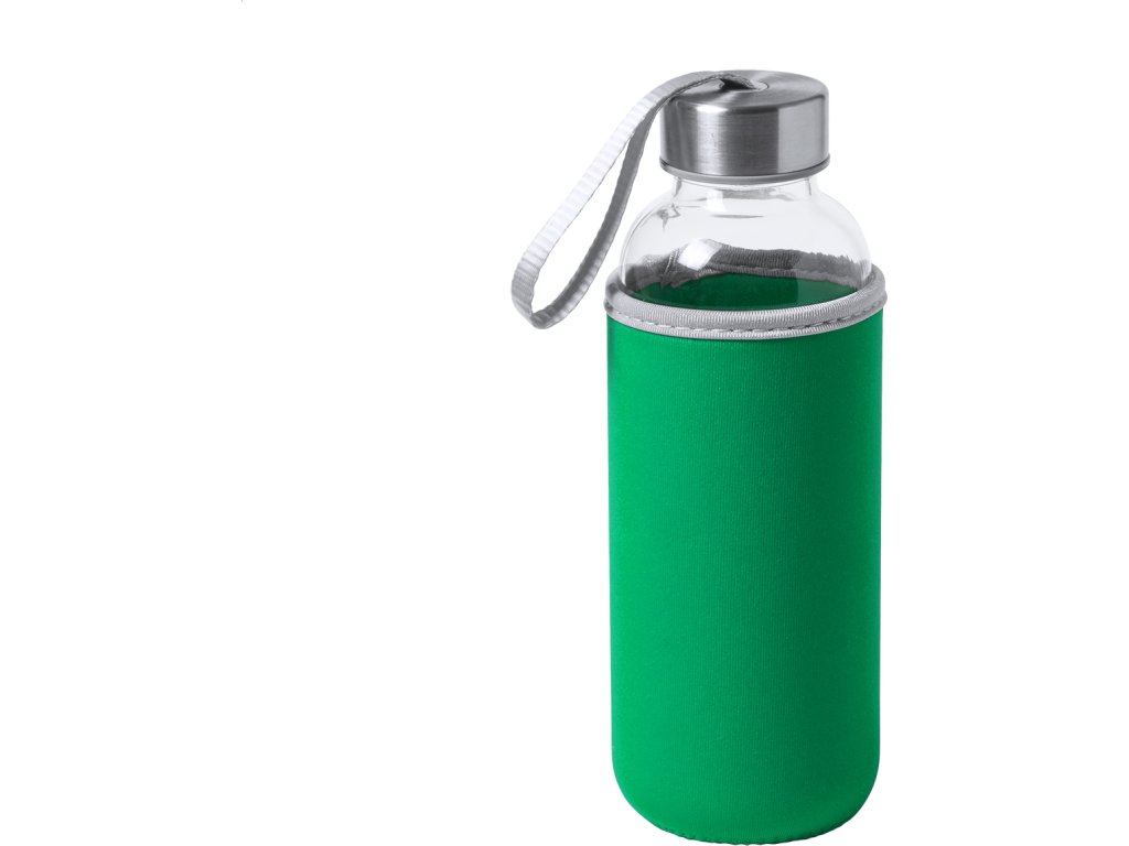 Skleněná láhev s popruhem na uzávěru a barevným neoprenovým krytem. 420 ml. Nevhodné pro sycené nápoje.