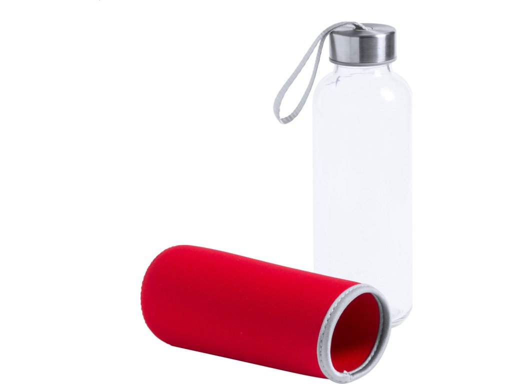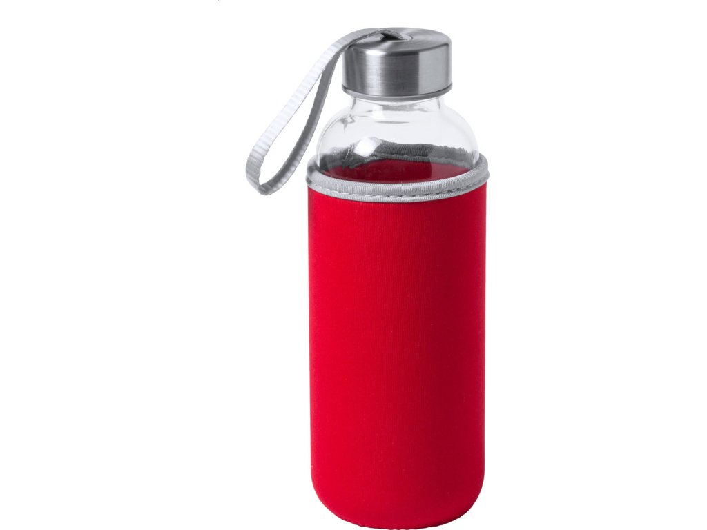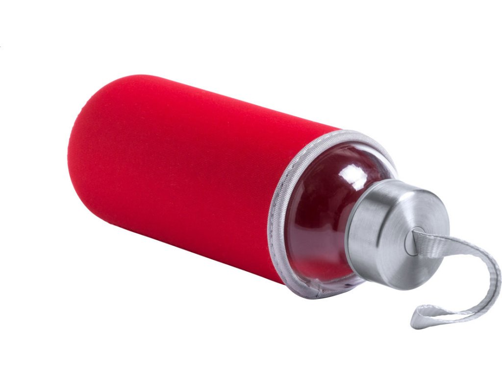 Skleněná láhev s popruhem na uzávěru a barevným neoprenovým krytem. 420 ml. Nevhodné pro sycené nápoje.