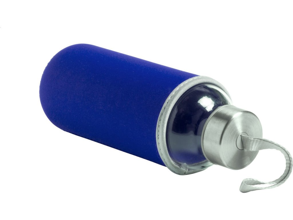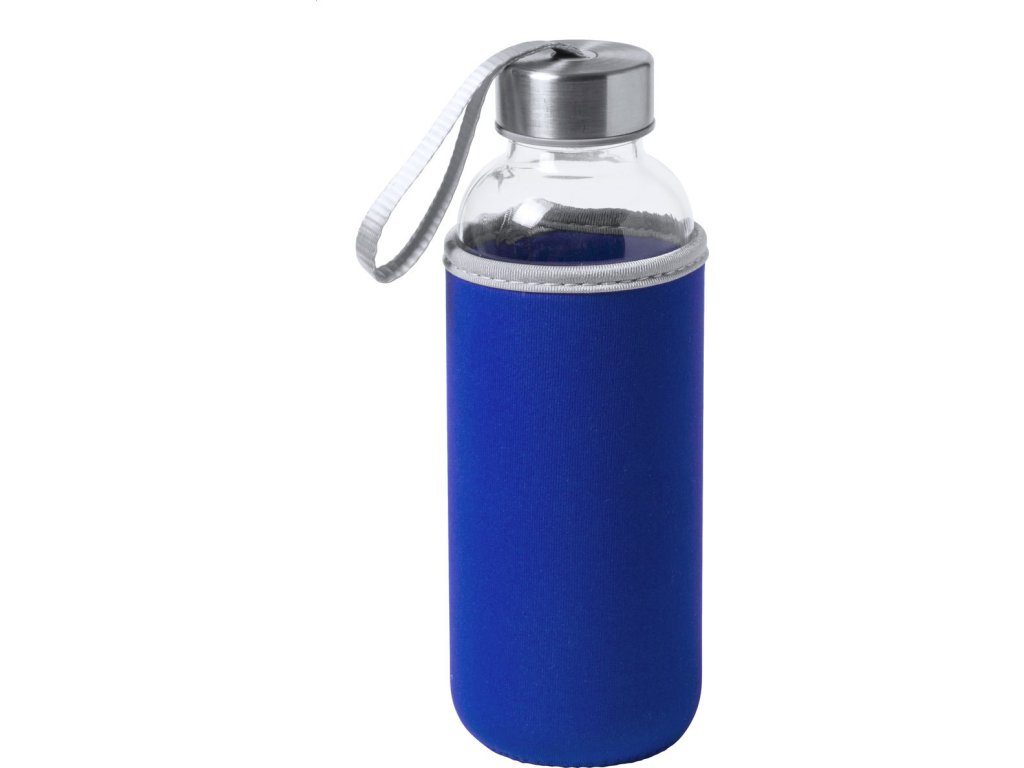 Skleněná láhev s popruhem na uzávěru a barevným neoprenovým krytem. 420 ml. Nevhodné pro sycené nápoje.