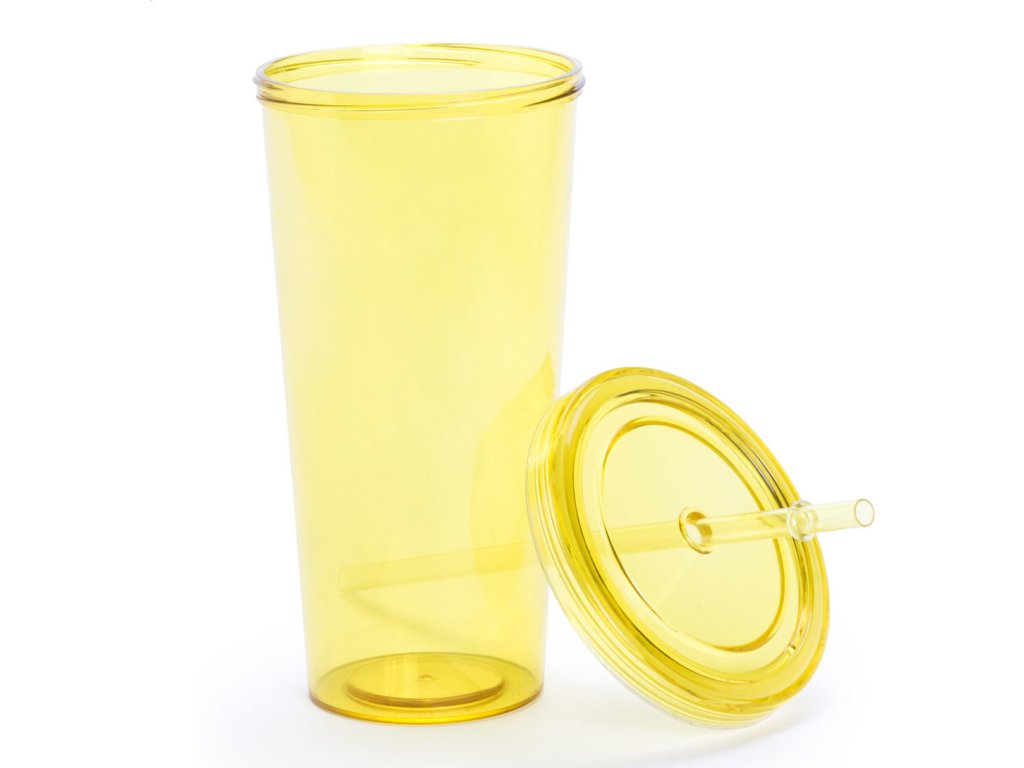 Barevný, průhledný plastový kelímek s brčkem, 750 ml.