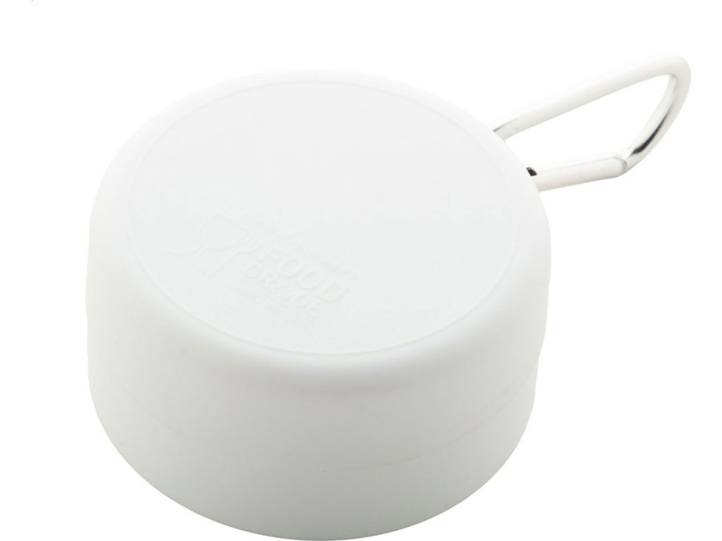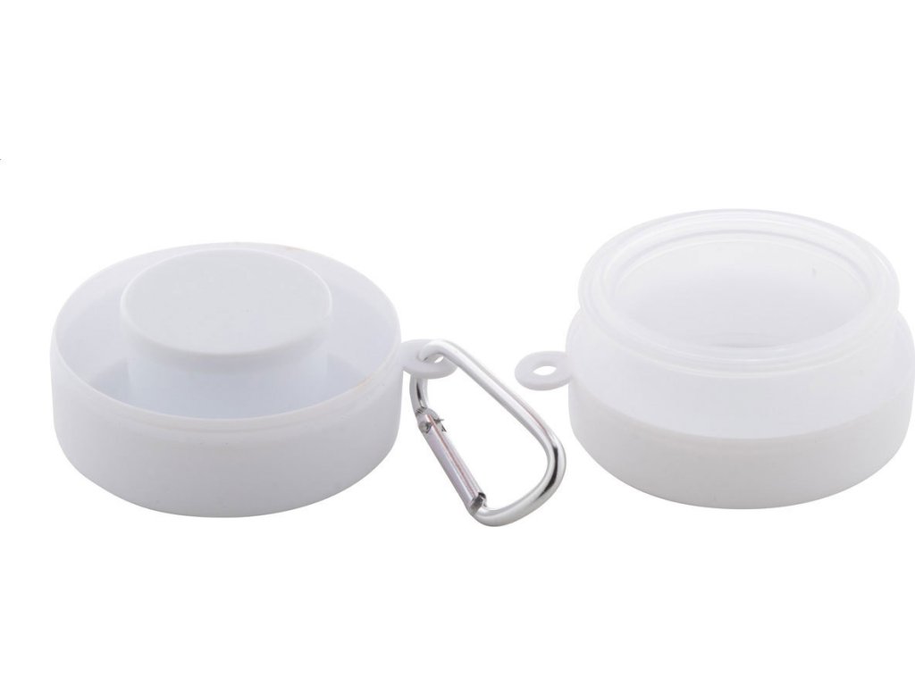 Skládací kelímek z recyklovaného PP plastu s přihrádkou na pilulky a kovovou karabinou. 220 ml. Bez BPA.