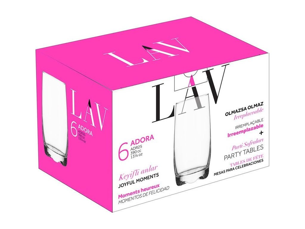 Sada obsahuje 6 kusů skleněných sklenic Adora o rozměrech 61x145 mm a objemu 390 ml. Tato sada vysokých a stylových sklenic slouží k podávání vody. Sklenice jsou vhodné do myčky nádobí.