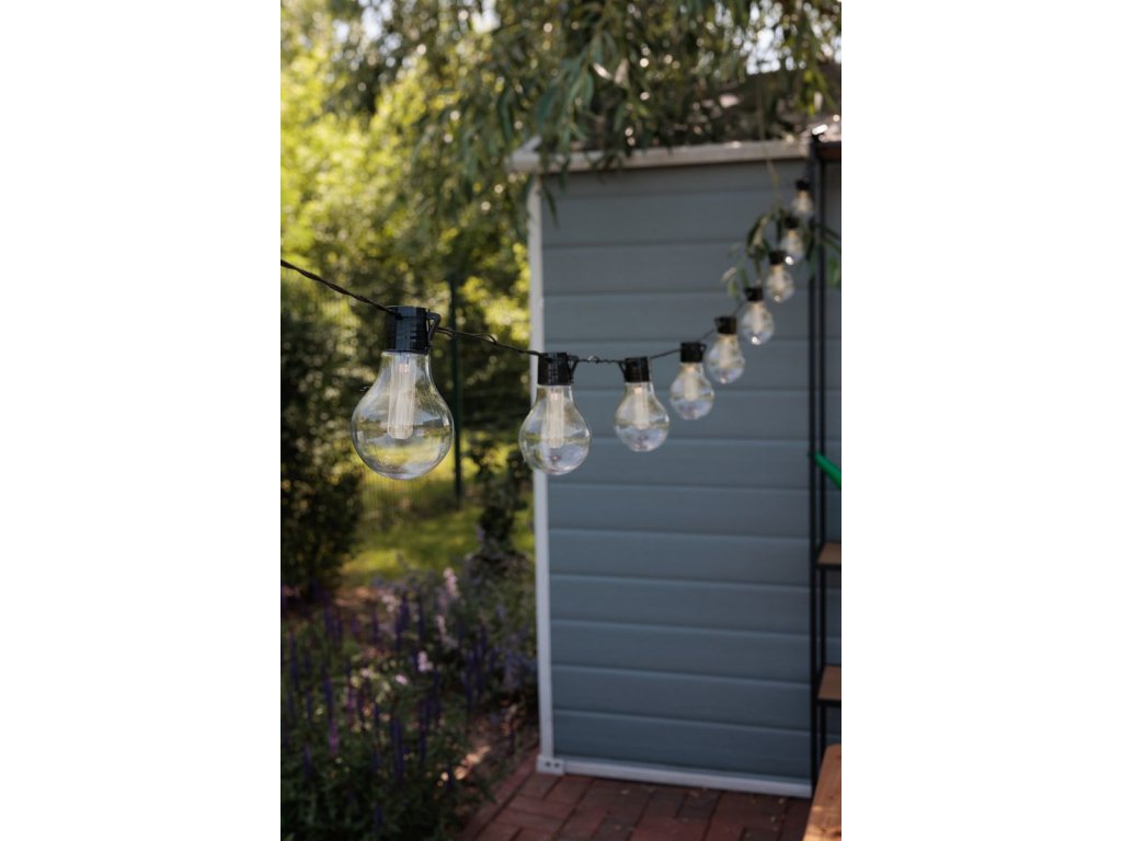 Řetěz Strend Pro Solar Garden je moderním doplňkem každé zahrady. Řetěz umístěte na zahradu nebo terasu, čímž vyzvednete její vzhled v přítmí. Během dne solární panel konvertuje sluneční energii na elektrickou energii, která se ukládá do dobíjecí baterie. V noci se světlo automaticky zapne a využívá uloženou energii. Řetěz obsahuje 10 luceren ve tvaru žárovek. Rozměr žárovky je 6x9 cm, délka řetězu se žárovkami je 2,7m. Přívodní kabel od první žárovky ke zdroji má délku 3 metry.