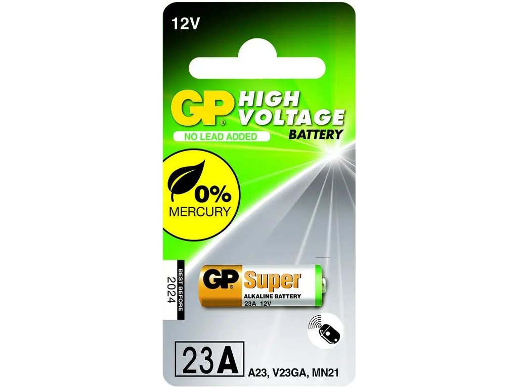 typové označení: GP 23AE (V23GA, MN21, A23), chemické složení: alkalické - speciální, kategorie/řada: High Voltage, napětí: 12 V, možnost nabíjení: ne, jmenovitá kapacita: 55 mAh (při zátěži 20 kOhm), rozměr: 10,22 × 28,5 mm, prodejní obal: 1 ks, blistr, cena za množství: cena za 1 ks
