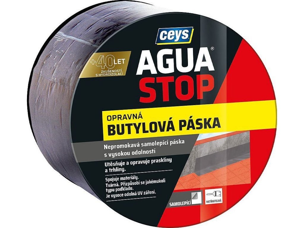 AGUA STOP BUTYLOVÁ VODOTĚSNÁ PÁSKA je samolepicí páska pro utěsnění a opravy trhlin a prasklin na střechách, krytech, střešních taškách, plechu a zdivu mezi chodníkem a vertikálními prvky.