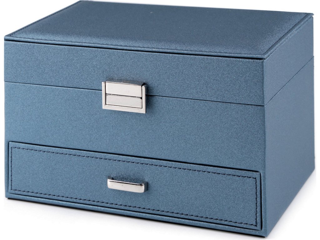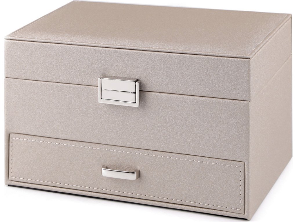 Elegantní 3 patrová šperkovnice na první pohled zaujme svým povrchem s decentním perleťovým leskem. Má kovové zapínání, spolehlivě ochrání šperky před nepříznivými vlivy okolí jako je světlo nebo vlhkost. Horní patro se rozkládá do stran. Obsahuje malé přihrádky, oddíl na prsteny a přepážky s dírkami na uložení náušnic. Prostřední patro má jeden velký prostor. Spodní patro tvoří vysunovací šuplík. Ve víku je zrcadlo, 2 háčky a kapsa. Šperkovnice má velice kvalitní a precizní provedení. Vnější potah je polyuretan, uvnitř je semiš. Šperkovnice č.4 - černá - má matný povrch bez perleťového lesku.