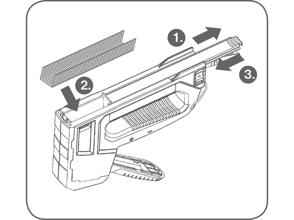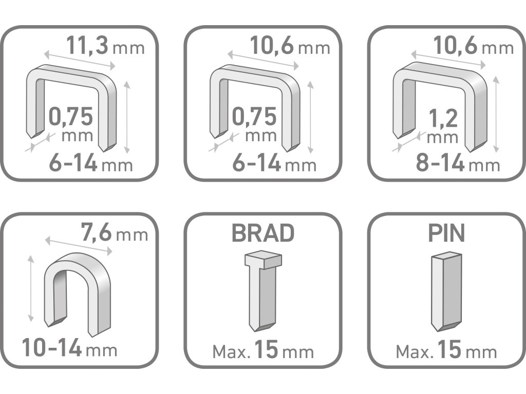 • doplňující parametr: vhodné pro 6 typů spon: výška 6-14mm, rozteč 10,6x tl.1,2mm+ rozteč 10,6x tl.0,75mm+rozteč 11,3x tl.0,75mm, kabelové spony výšky 10-14mm rozteč 7,6mm, hřebíky s hlavičkou i bez hlavičky do max. délky 15mm