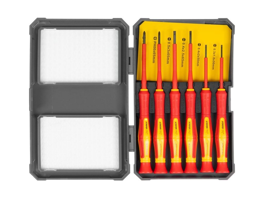 Sada šroubováků Strend Pro VDE, 6-dílná je určena pro bezpečnou práci s elektroinstalacemi. Obsahuje ploché a Phillips šroubováky s VDE izolací , která poskytuje ochranu při práci.