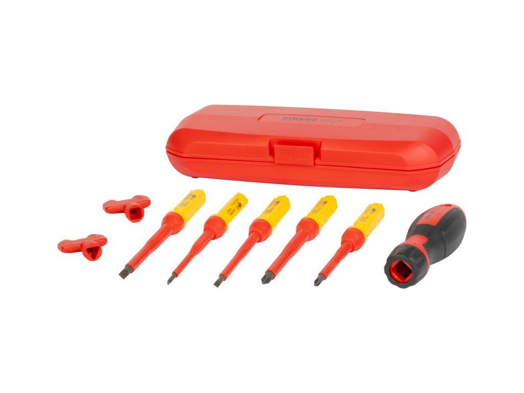 Sada šroubováků Strend Pro VDE, 8-dílná je speciálně navržena pro elektrikářské práce. Obsahuje ploché a Phillips šroubováky s izolací VDE , která poskytuje bezpečnost při práci pod napětím až do 1000 V.