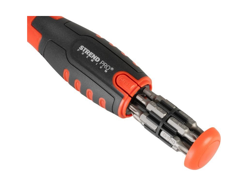 Šroubovák Strend Pro Premium se sadou 12 bitů je univerzální a praktický nástroj pro různé montážní a opravářské práce. Obsahuje bity Torx, ploché a Phillips , což umožňuje široké využití v dílně i domácnosti.