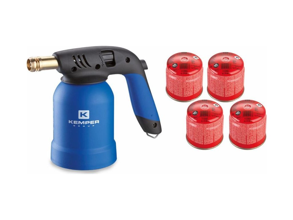 KEMPER - Opalovací hořák piezo + 4x STOPGAS plynová kartuše 360 ml (190 g)