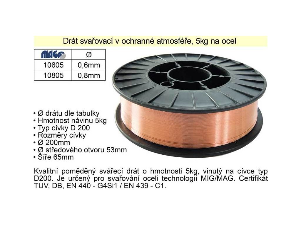 Kvalitní poměděný svářecí drát průměr 0,6mm, o hmotnosti 5kg, vinutý na cívce D200. Je určený pro svařování oceli technologií MIG/MAG v ochranné atmosféře. Certifikát TUV, DB, EN 440 - G4Si1 / EN 439 - C1