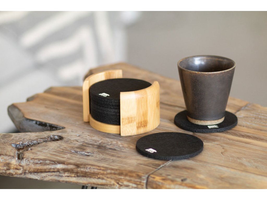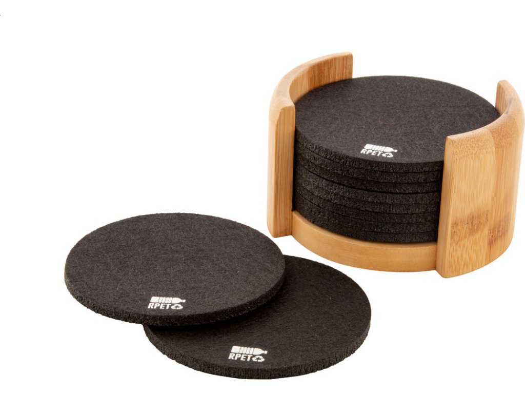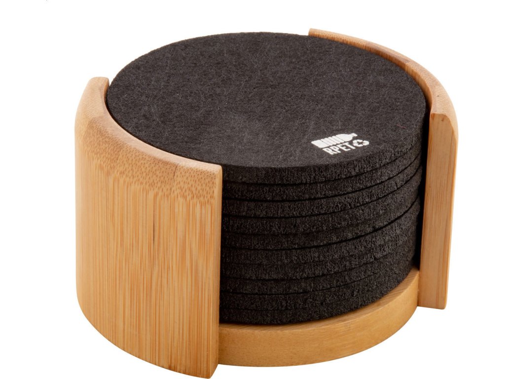 Sada 10 ks RPET filcového podtácku v bambusovém držáku na stůl. S výrazným logem RPET na každém tácku.