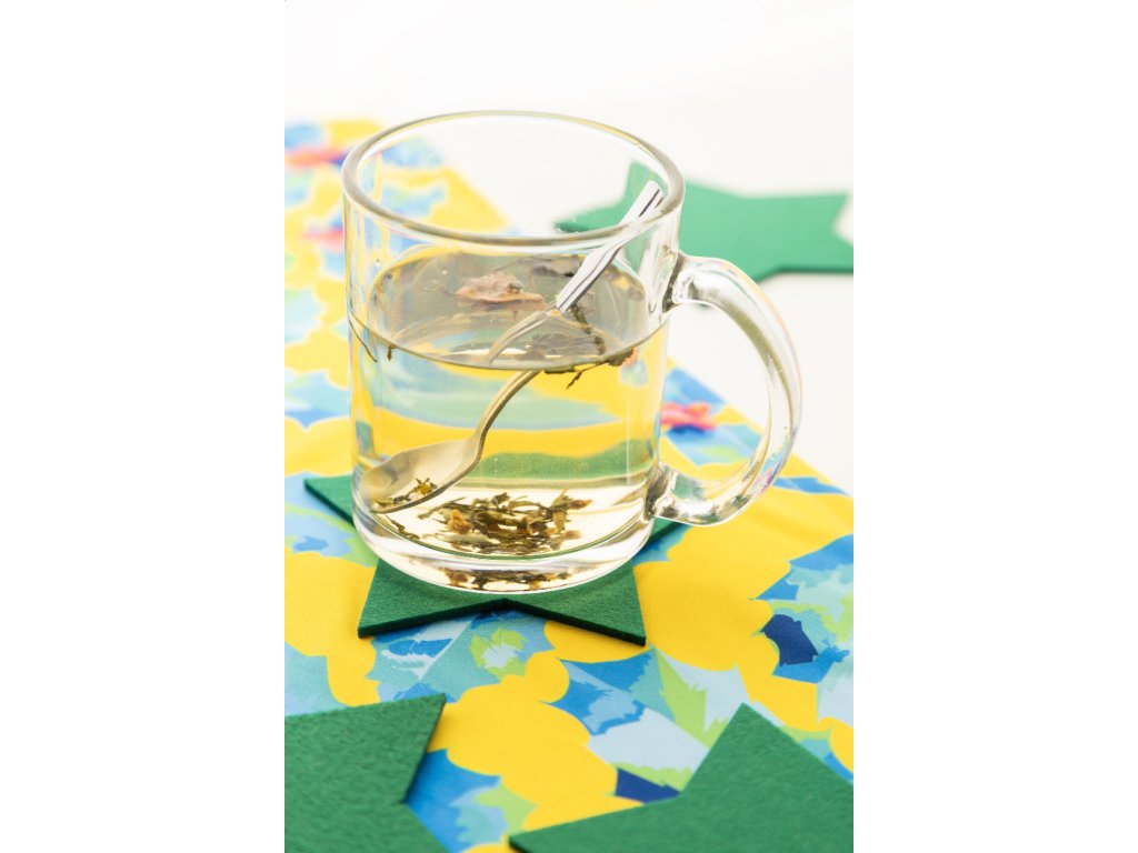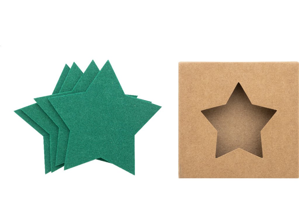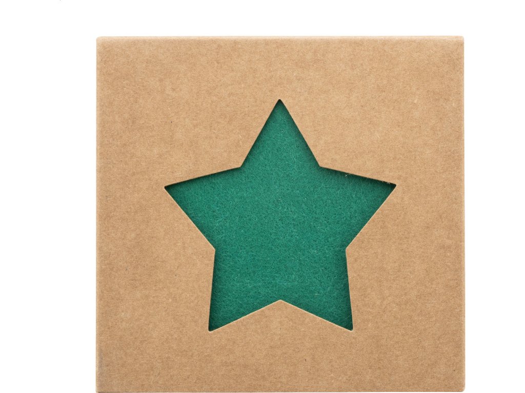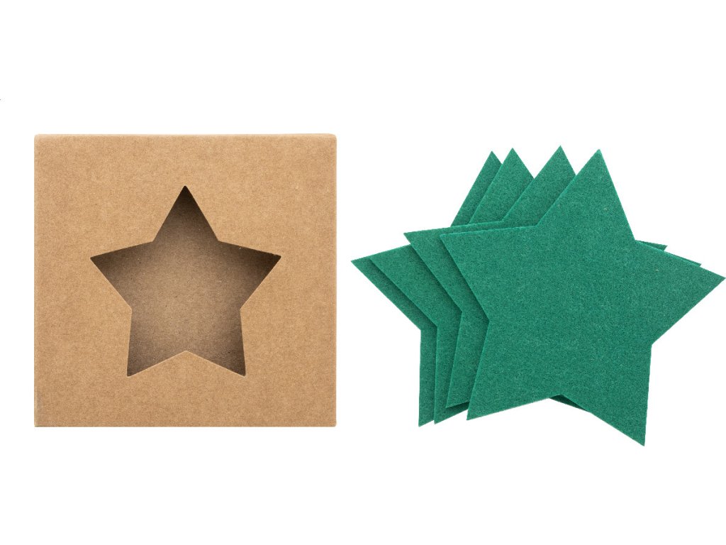 Sada 4 vánočních podtácků z plsti RPET ve tvaru hvězdy. V krabičce z kraftového papíru.