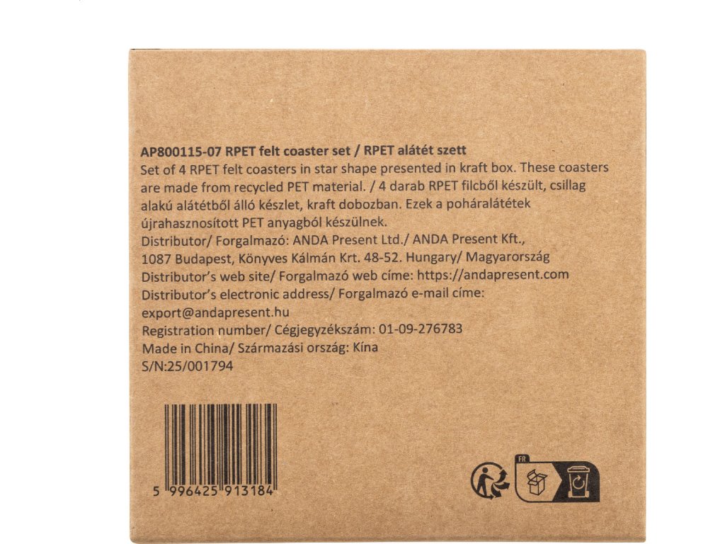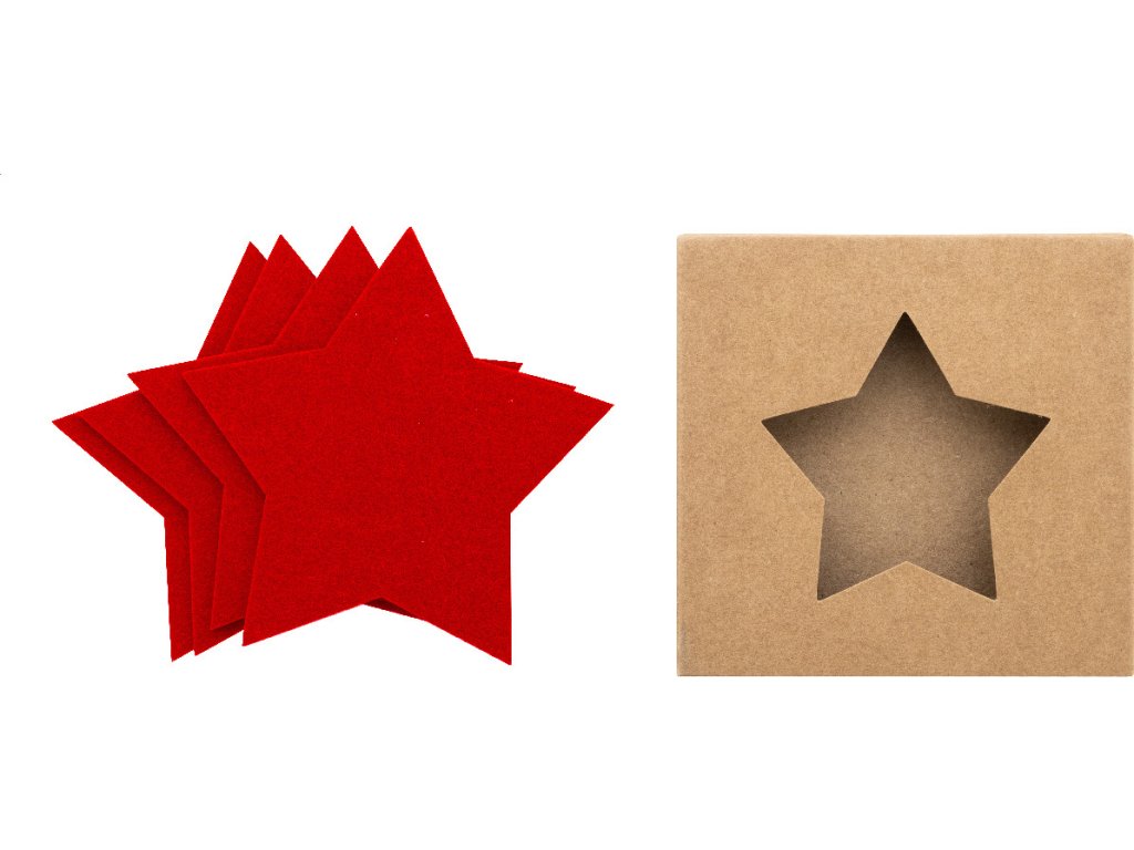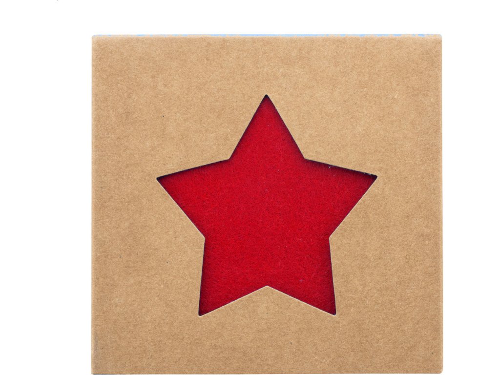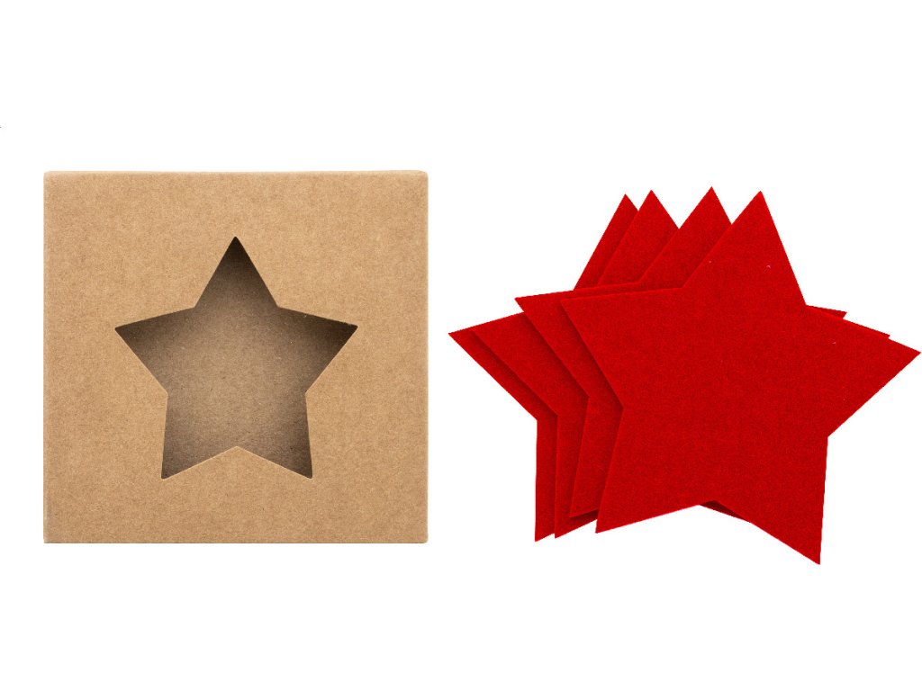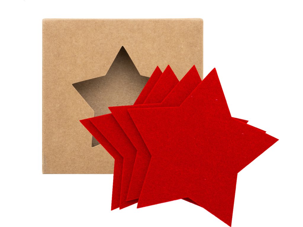 Sada 4 vánočních podtácků z plsti RPET ve tvaru hvězdy. V krabičce z kraftového papíru.