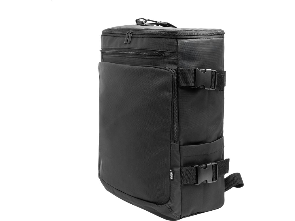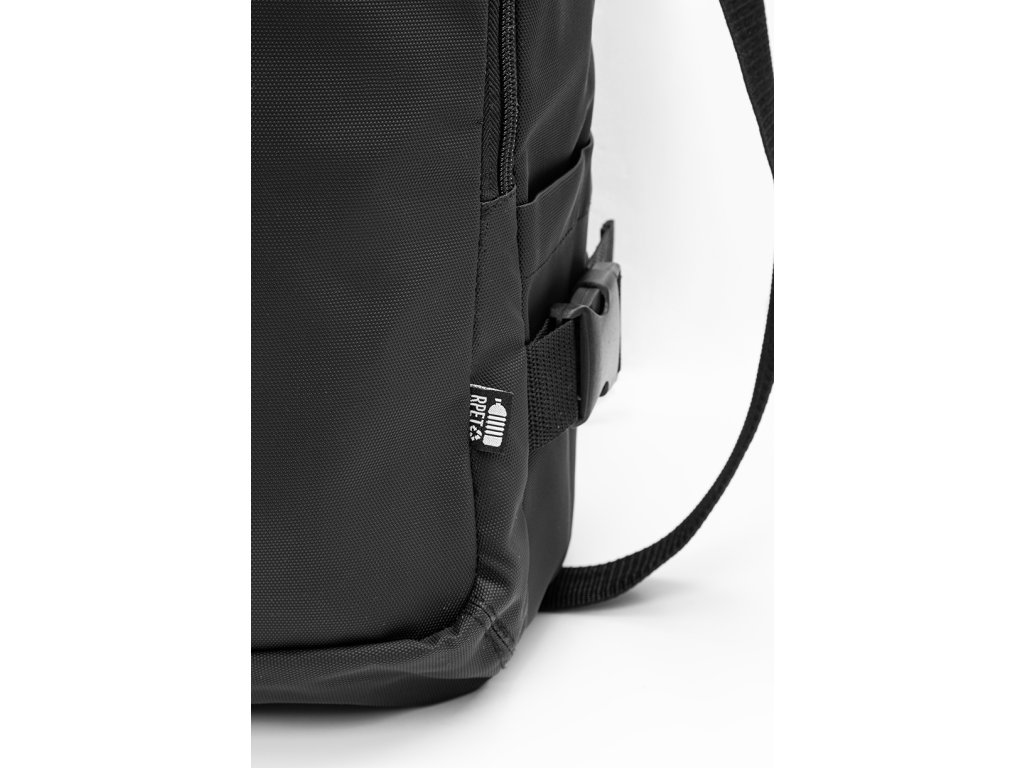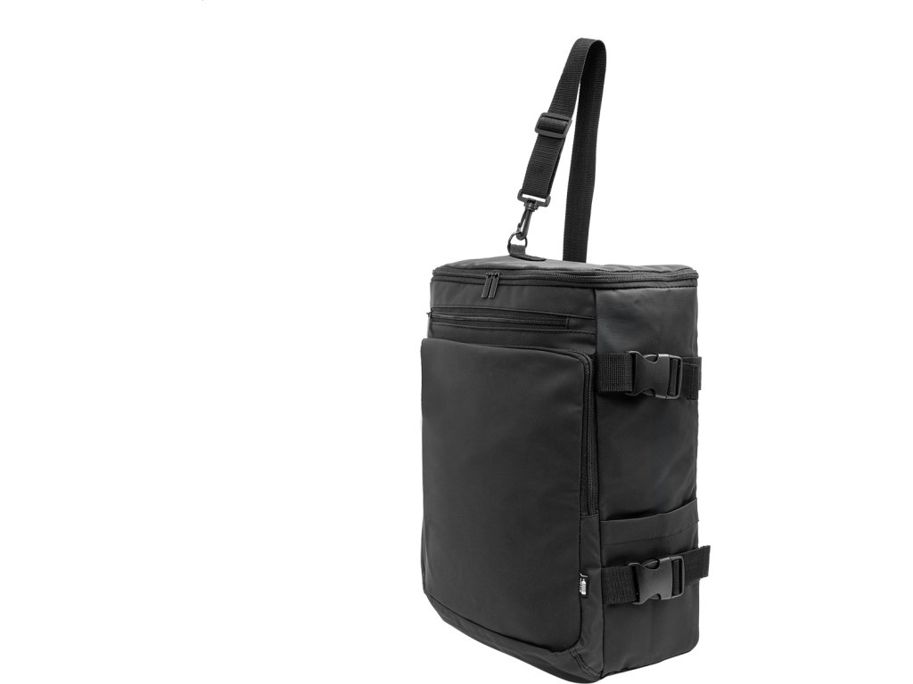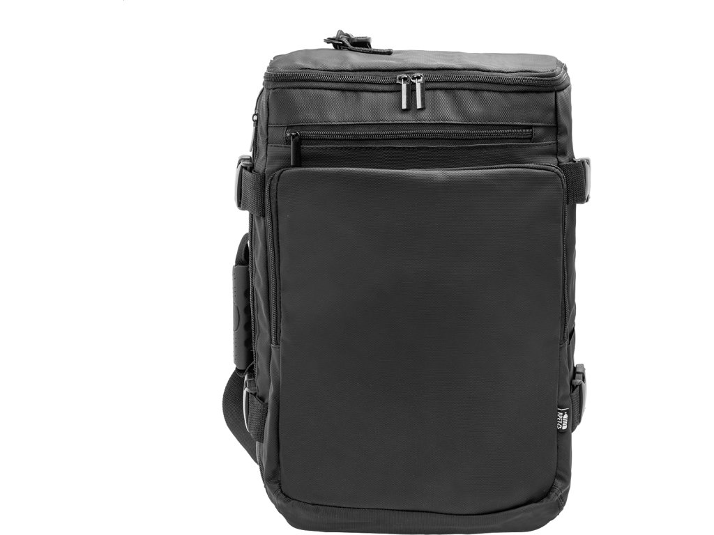 Voděodolný batoh a taška na dokumenty z RPET s dvojitou funkcí, hlavní přihrádkou na zip, dvěma předními kapsami na zip, boční kapsou, bočními popruhy s přezkou a polstrovanou přihrádkou na notebook (15"). S polstrovanými zády a odnímatelnými ramenními popruhy. Součástí je i další odnímatelný ramenní popruh pro použití jako taška na dokumenty. Polyester 600D RPET s PU zátěrem a výrazným štítkem RPET.