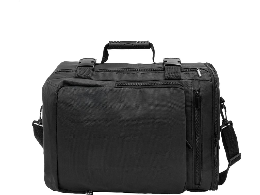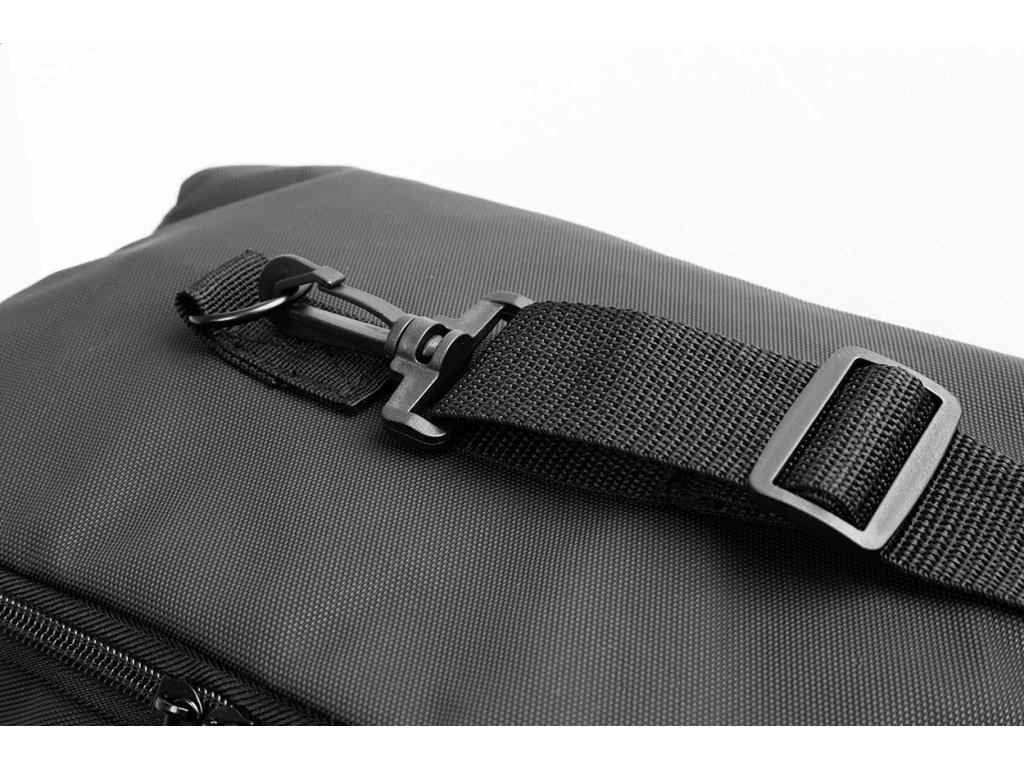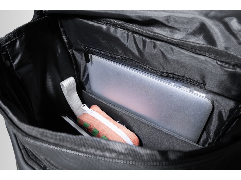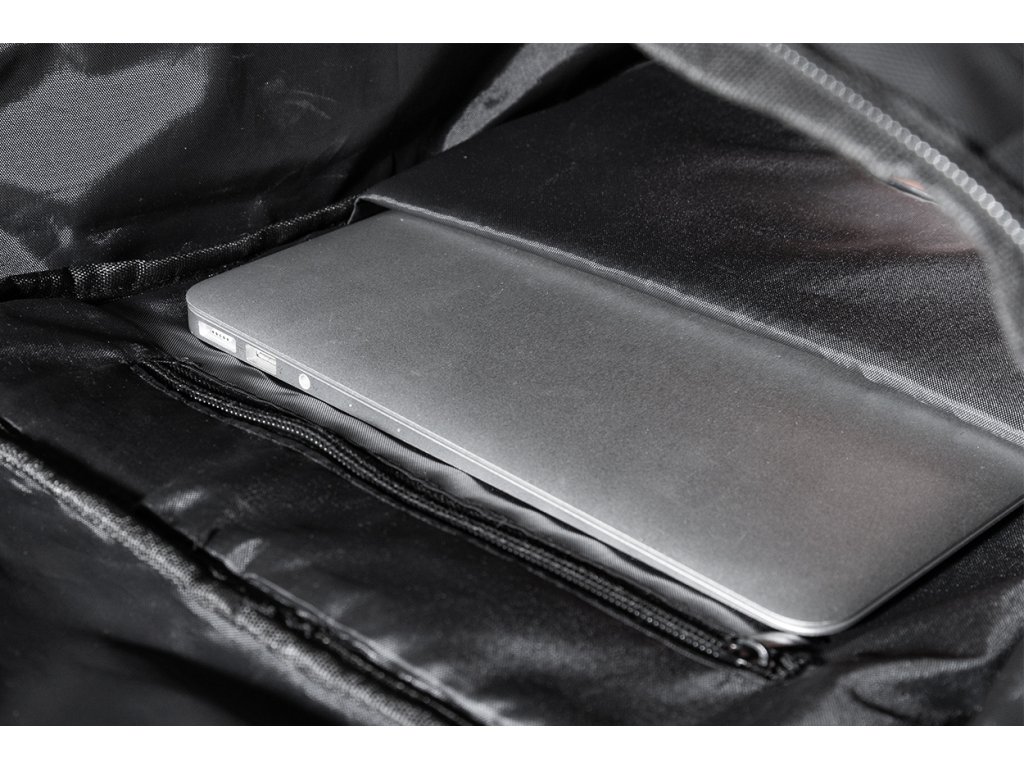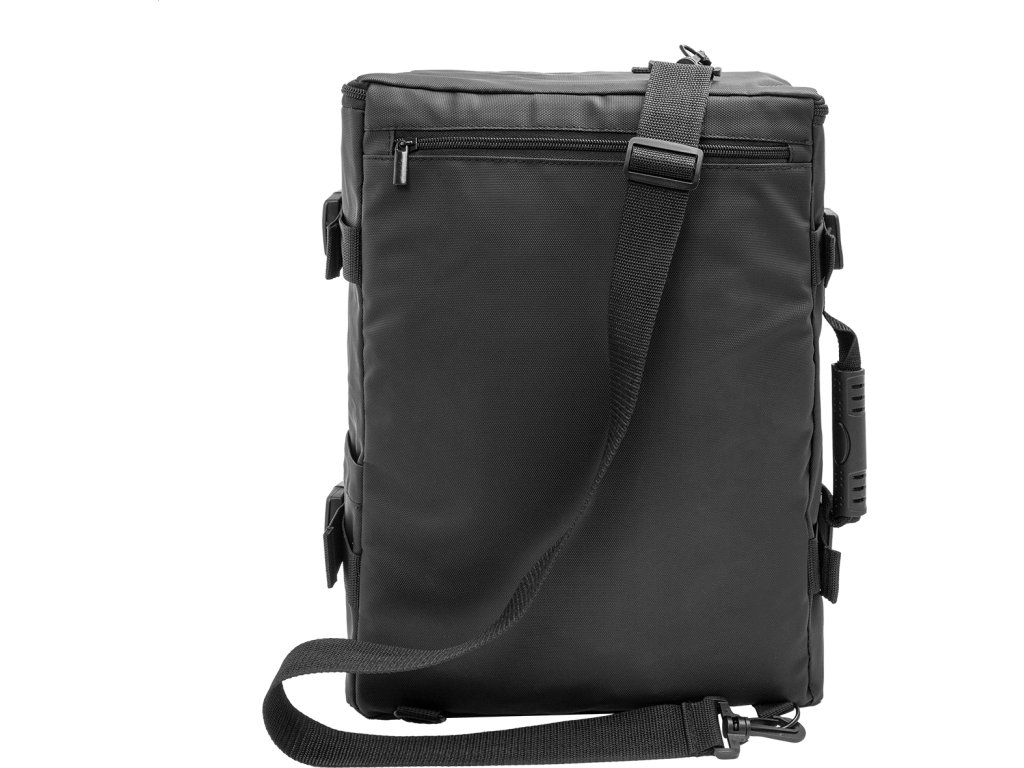 Voděodolný batoh a taška na dokumenty z RPET s dvojitou funkcí, hlavní přihrádkou na zip, dvěma předními kapsami na zip, boční kapsou, bočními popruhy s přezkou a polstrovanou přihrádkou na notebook (15"). S polstrovanými zády a odnímatelnými ramenními popruhy. Součástí je i další odnímatelný ramenní popruh pro použití jako taška na dokumenty. Polyester 600D RPET s PU zátěrem a výrazným štítkem RPET.