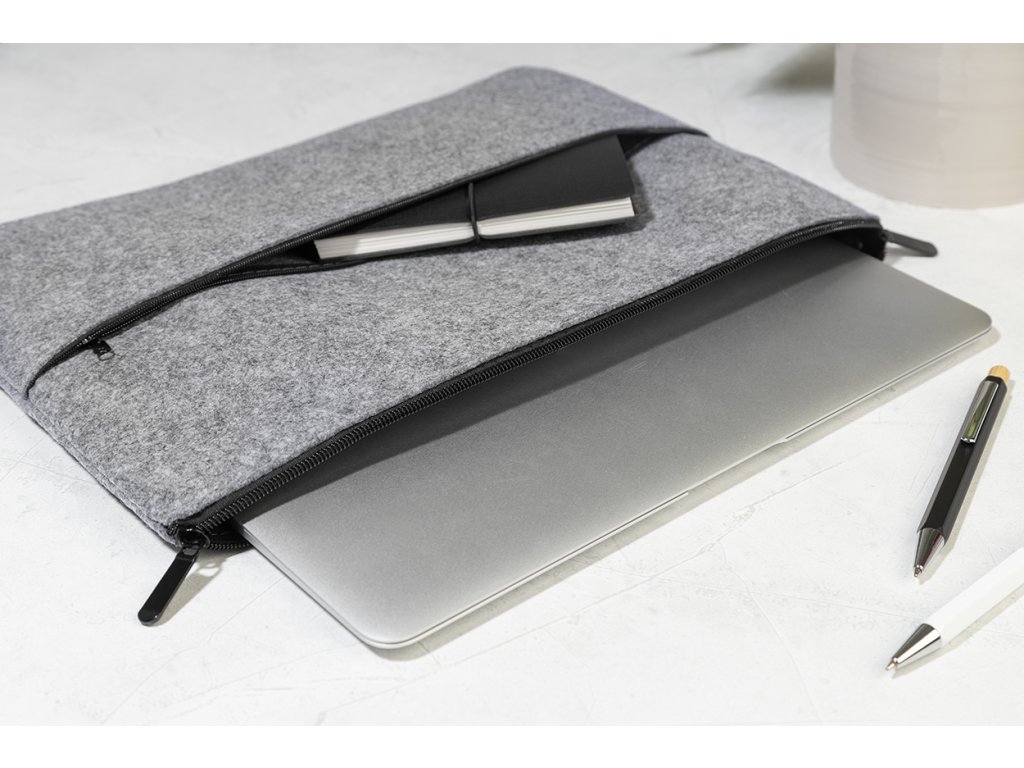 Taška na notebook z RPET plsti s přihrádkou na zip a přední kapsou. Vhodné pro notebooky do 15". S výrazným štítkem RPET.