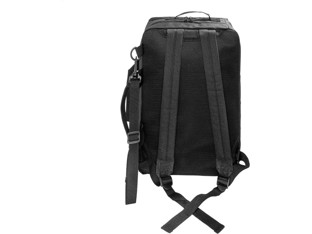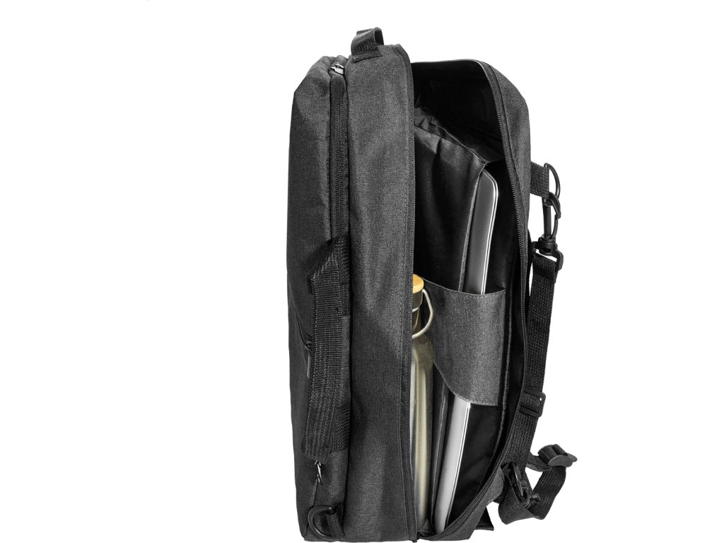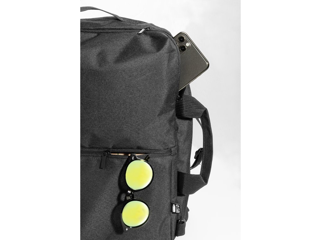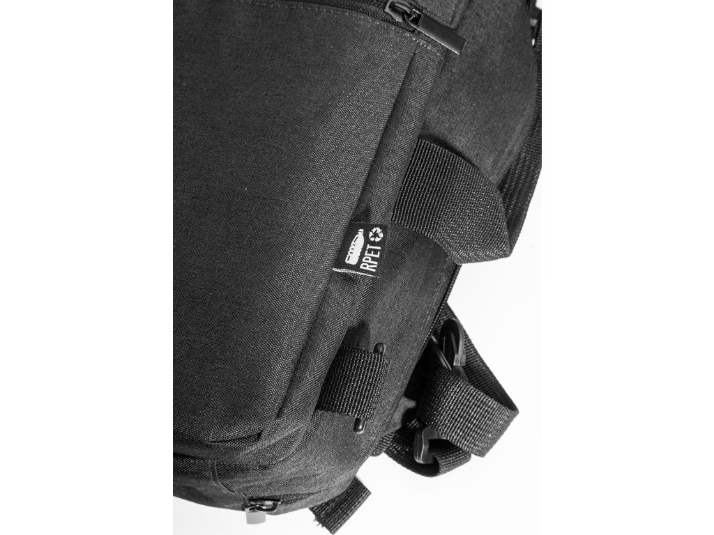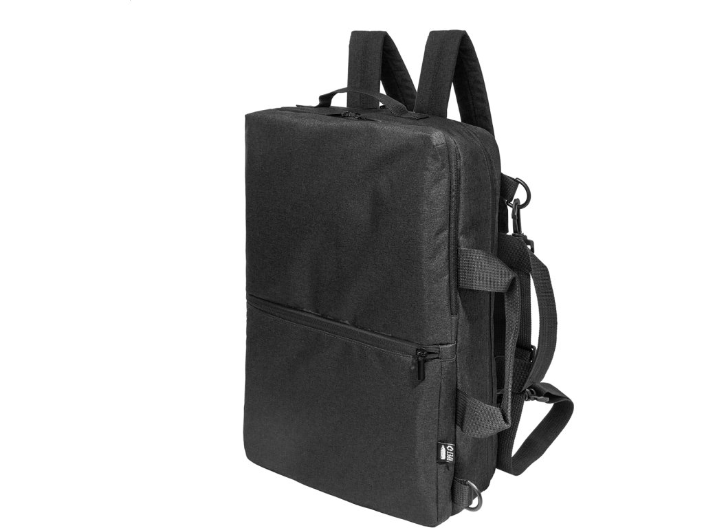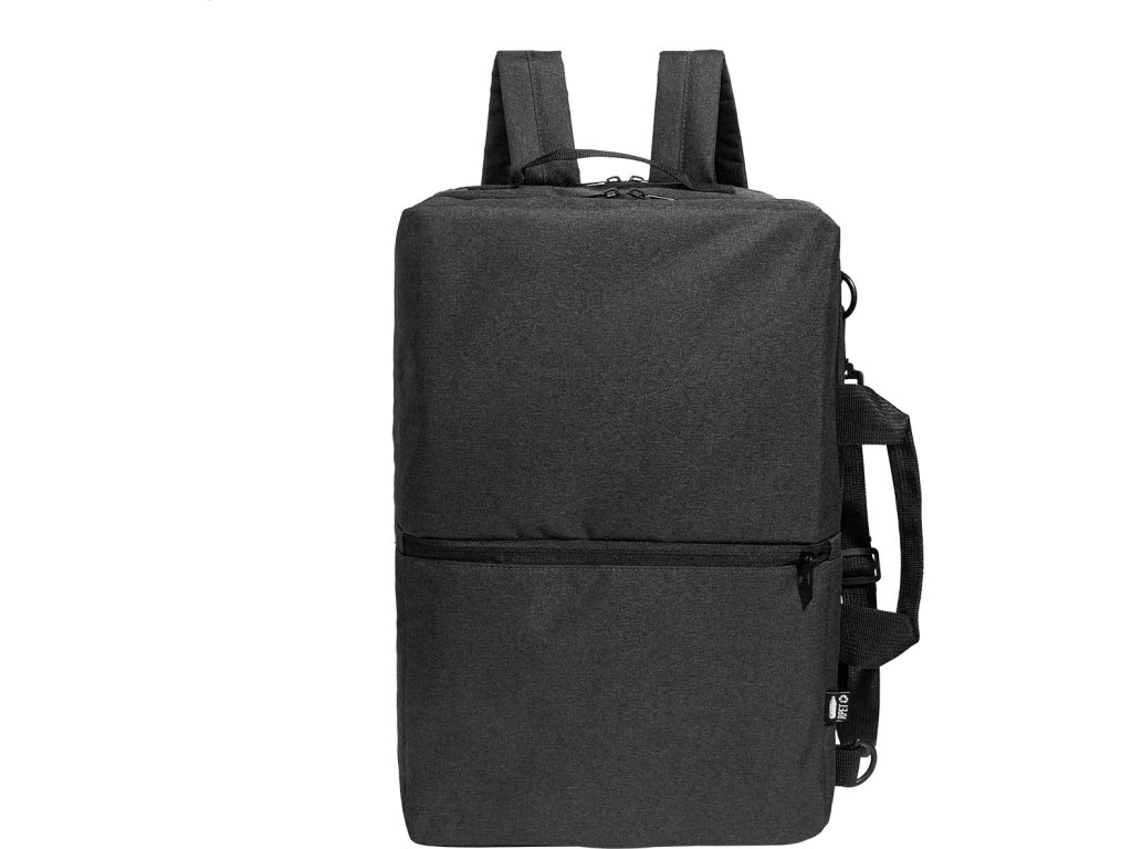 Dvojfunkční RPET batoh a taška na dokumenty s přihrádkou na zip, 2 předními kapsami na zip a polstrovanou přihrádkou na notebook (15"). S polstrovanými zády a ramenními popruhy. Součástí je i odnímatelný ramenní popruh pro použití jako taška na dokumenty. 600D RPET polyester s výrazným štítkem RPET.