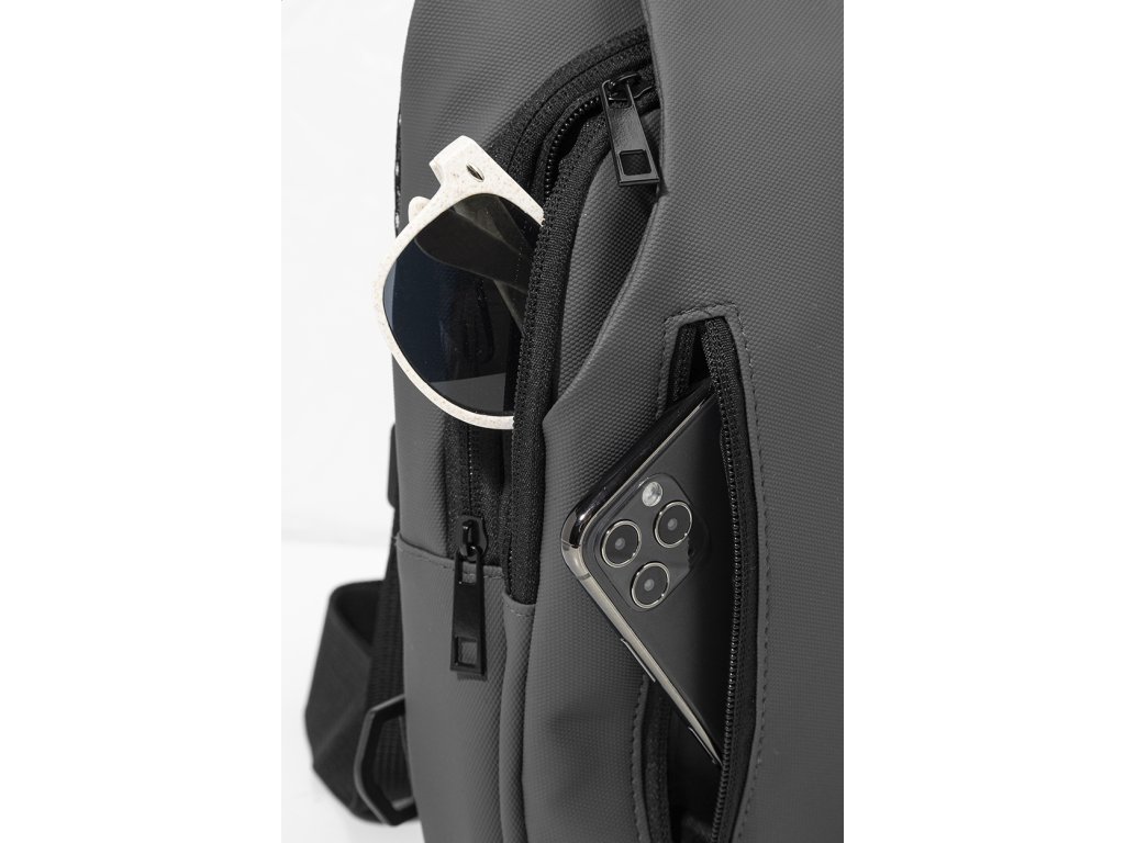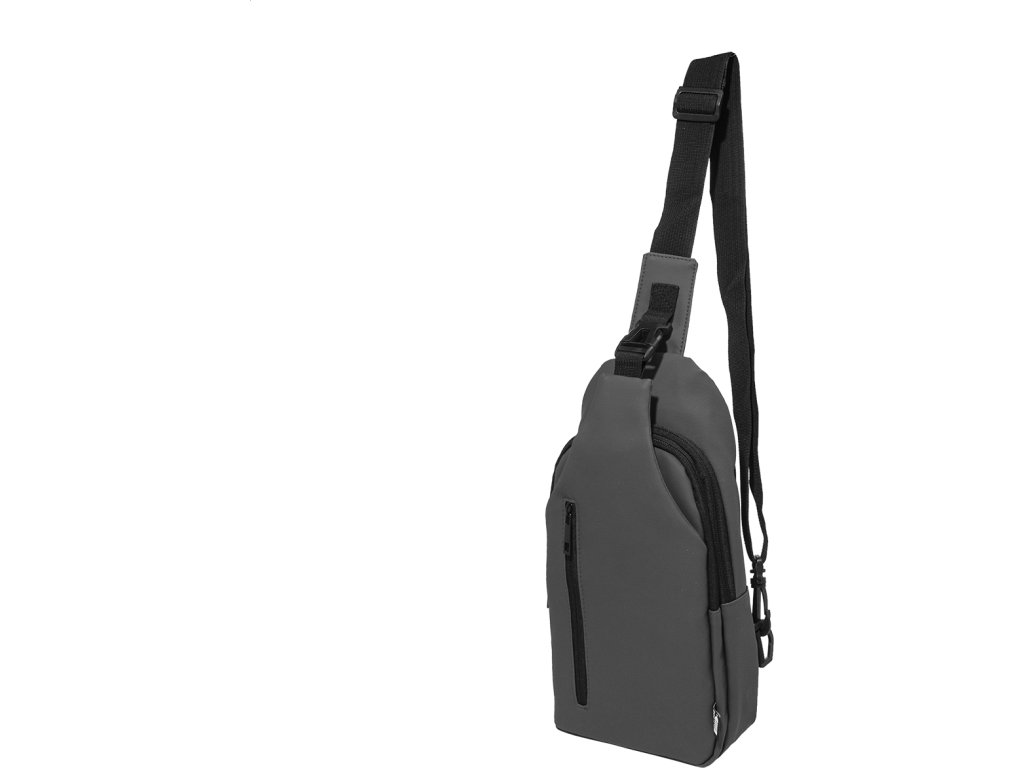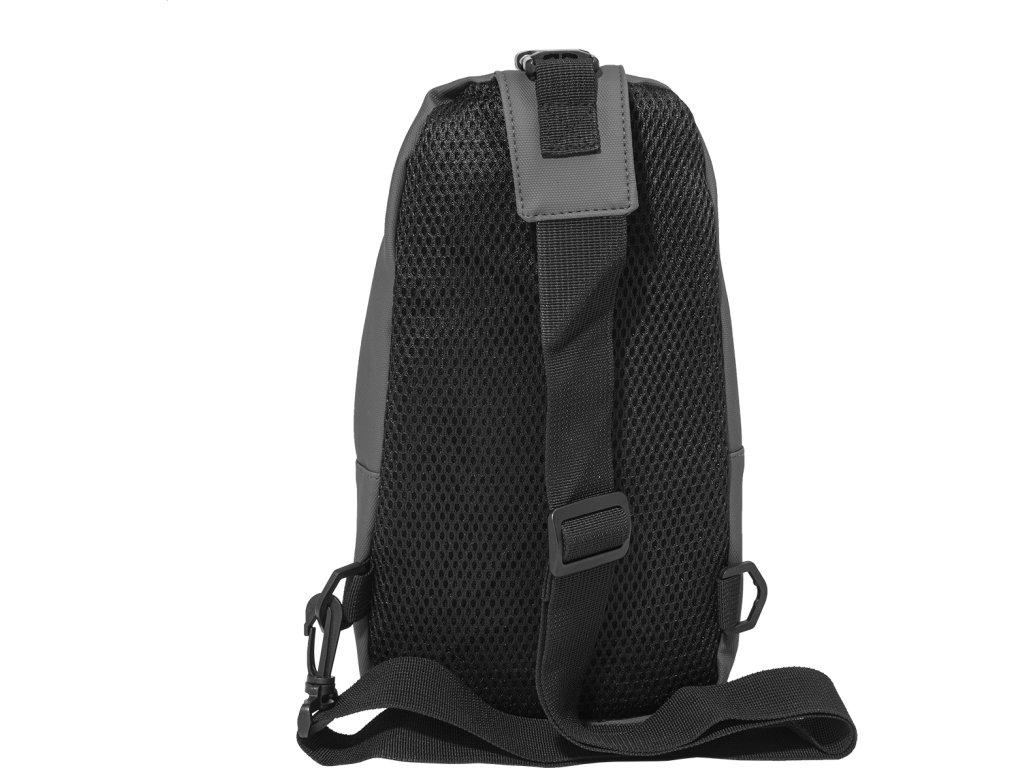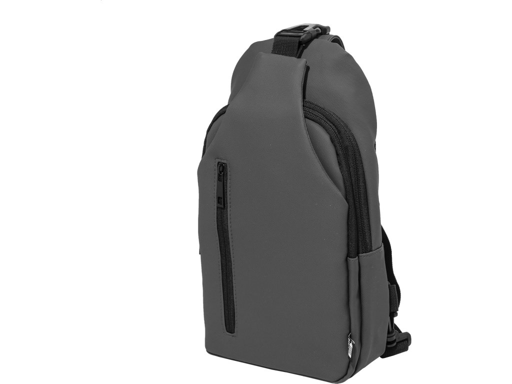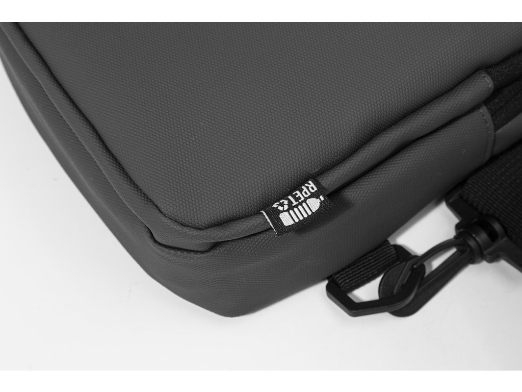 Voděodolná RPET crossbody taška na zavěšení přes rameno s kapsami na zip, zapínáním na přezku a polstrovanými zády. S nastavitelným ramenním popruhem vybaveným polohami na levé a pravé straně. Polyester RPET 600D potažený PU, s výraznou etiketou RPET.