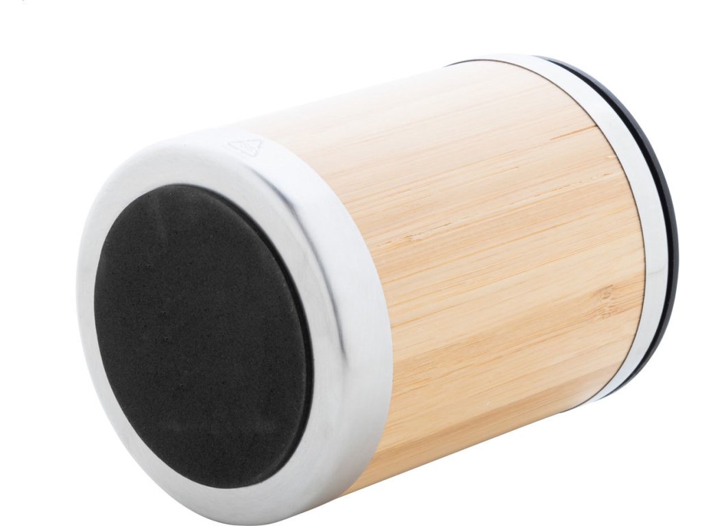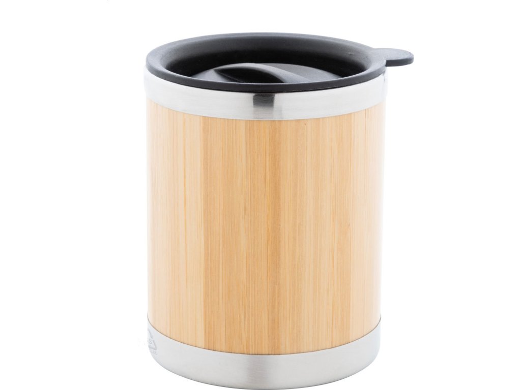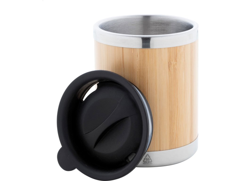 Bambusem pokrytý, dvoustěnný recyklovaný nerezový izolovaný termo hrnek s PP víčkem na pití, 300 ml.