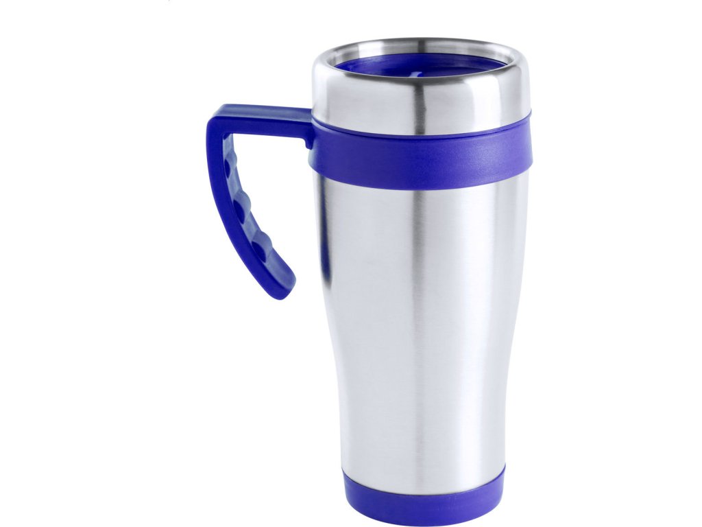 Nerezový termo hrnek z nerez oceli s barevnými plastovými částmi a uchem, 450 ml. V dárkové krabičce.