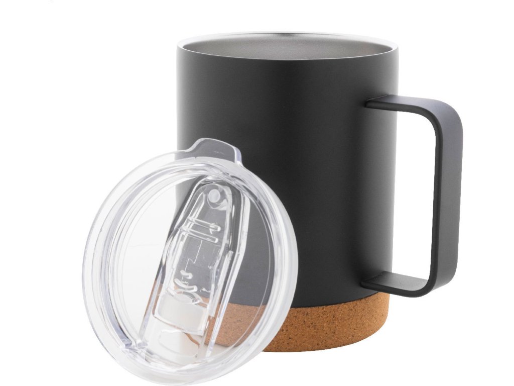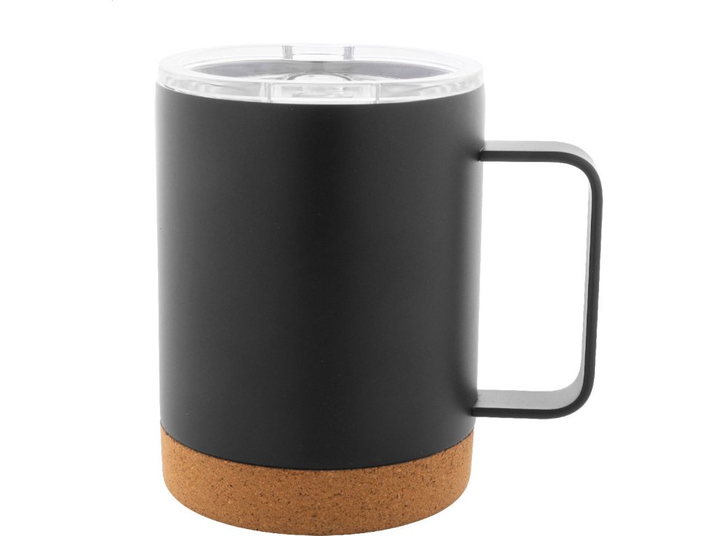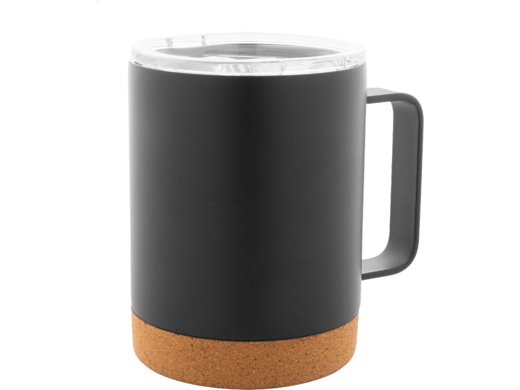 Dvoustěnný nerezový termohrnek s víčkem na pití a dnem z přírodního korku, 330 ml. V kraftové papírové krabici.