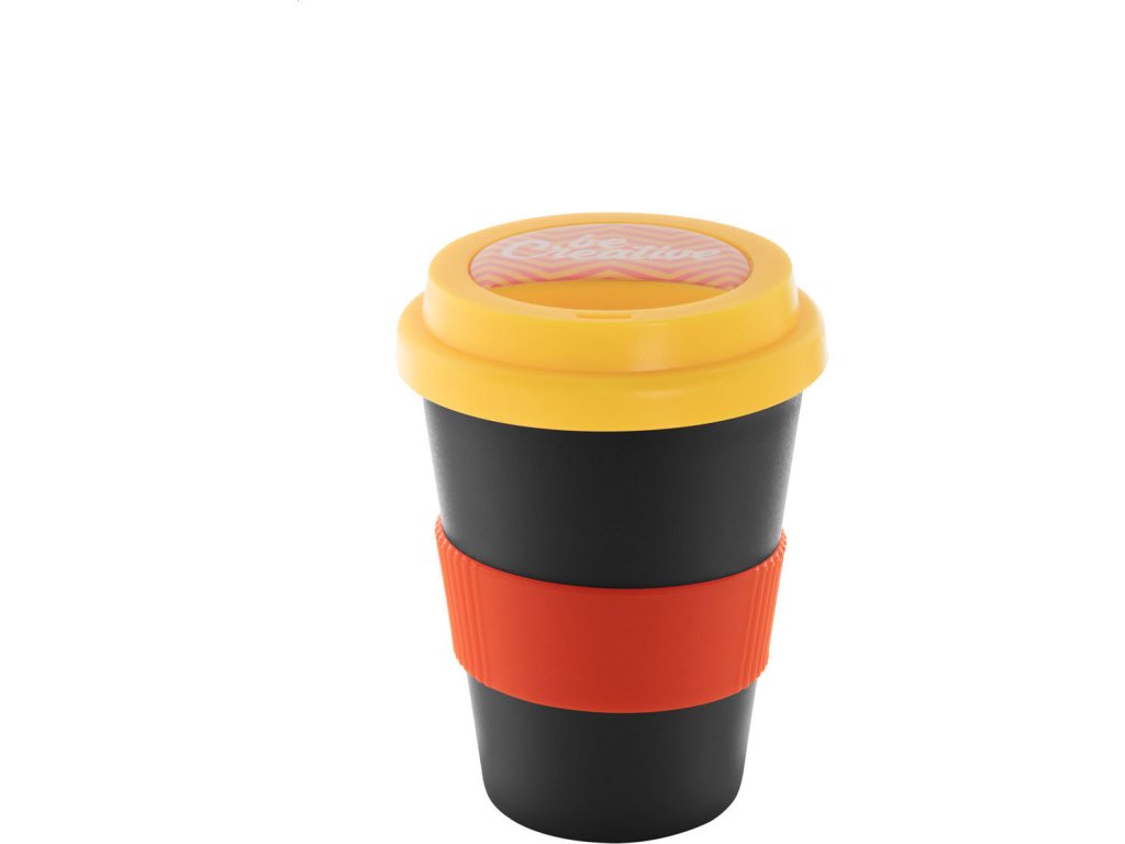 Dvoustěnný plastový termo hrnek s víčkem na pití a silikonovým úchopem na zakázku. 300 ml. Min. mn.: 50 ks.