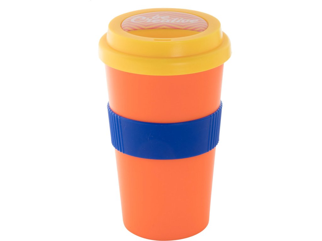 Dvoustěnný plastový termo hrnek s víčkem na pití a silikonovým úchopem na zakázku. 400 ml. Min. mn.: 50 ks.