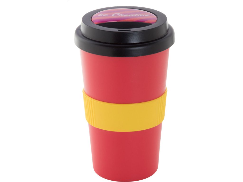 Dvoustěnný plastový termo hrnek s víčkem na pití a silikonovým úchopem na zakázku. 400 ml. Min. mn.: 50 ks.