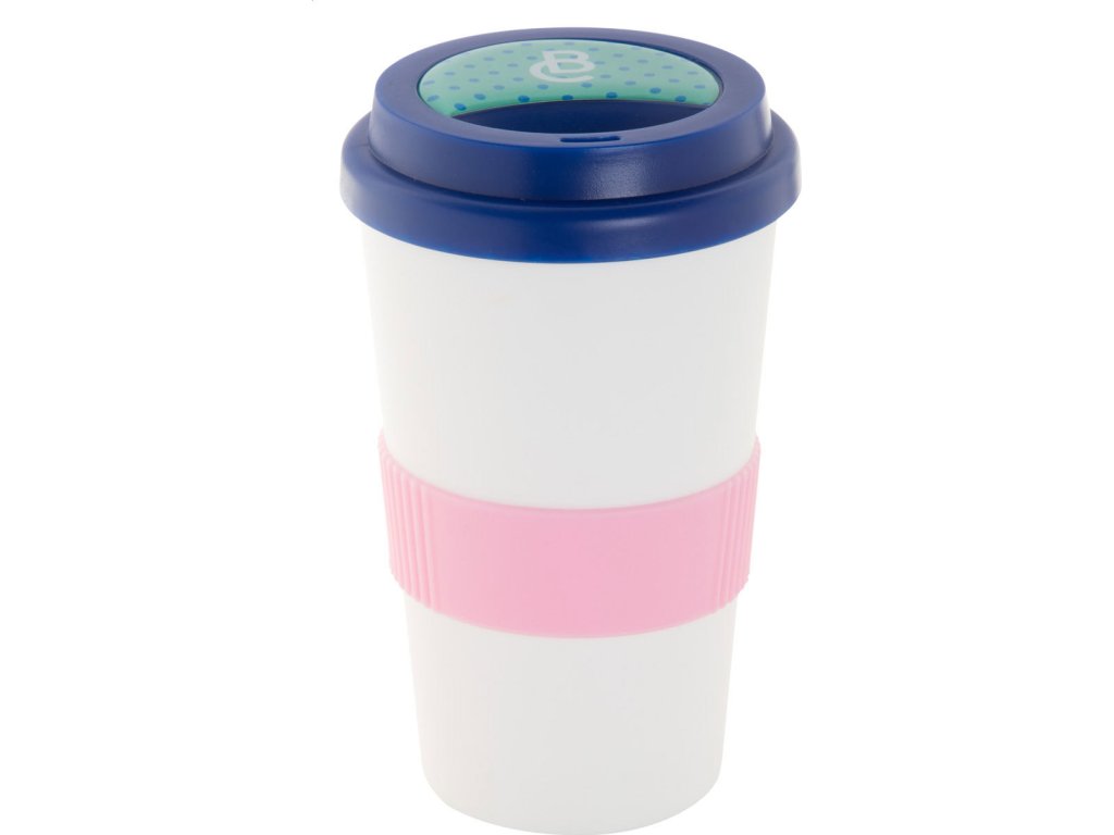 Dvoustěnný plastový termo hrnek s víčkem na pití a silikonovým úchopem na zakázku. 400 ml. Min. mn.: 50 ks.