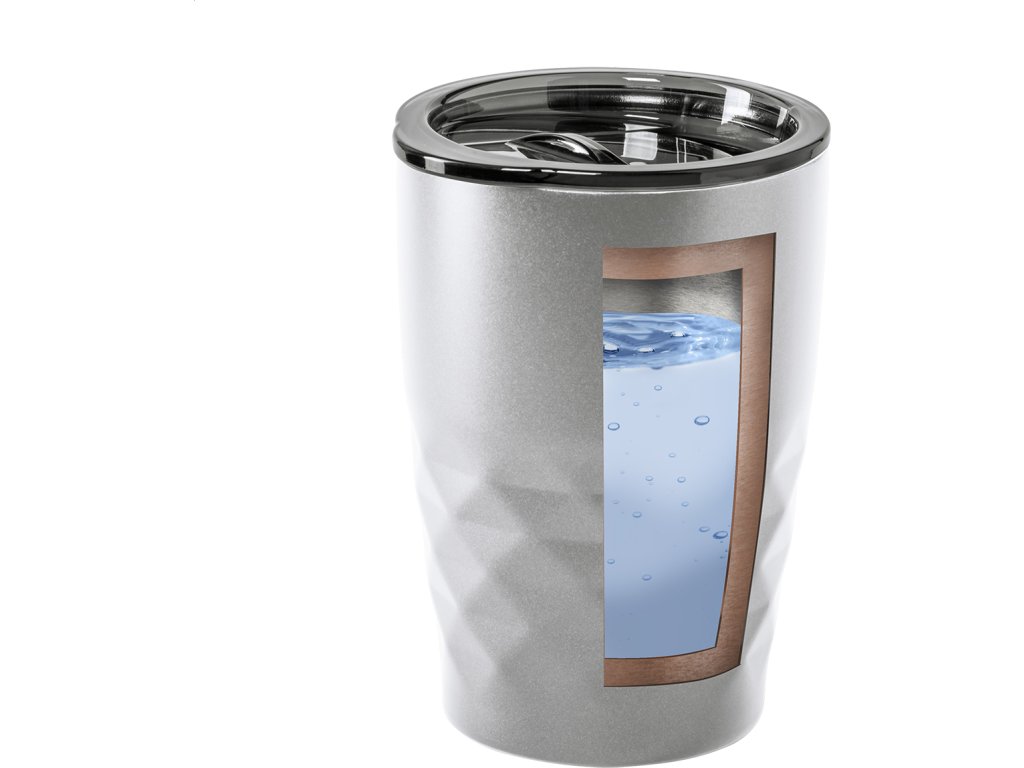 Dvoustěnný nerezový, měděný vakuově izolovaný termo hrnek s plastovým víčkem na pití. 350 ml. Měděná izolace udrží nápoje horké 12 a studené 24 hodin.