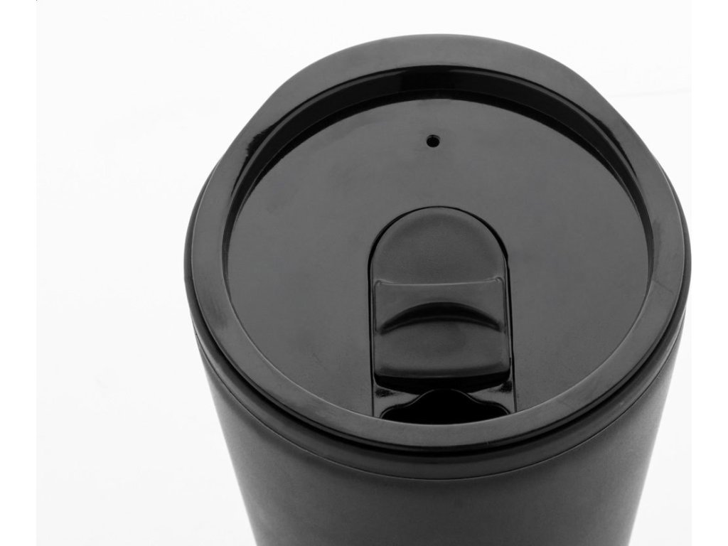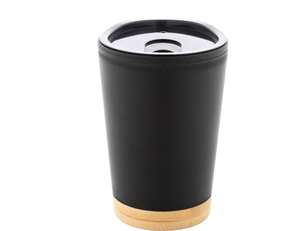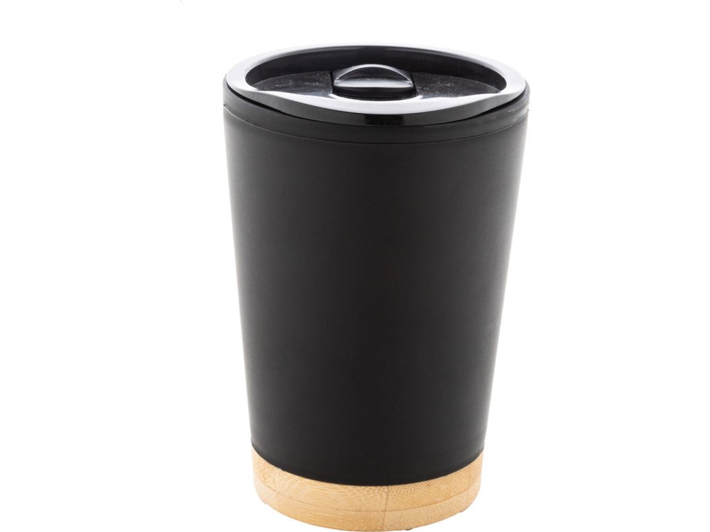 Dvoustěnný termo hrnek izolovaný PP plastem s víčkem na pití a bambusovým dnem, 260 ml.