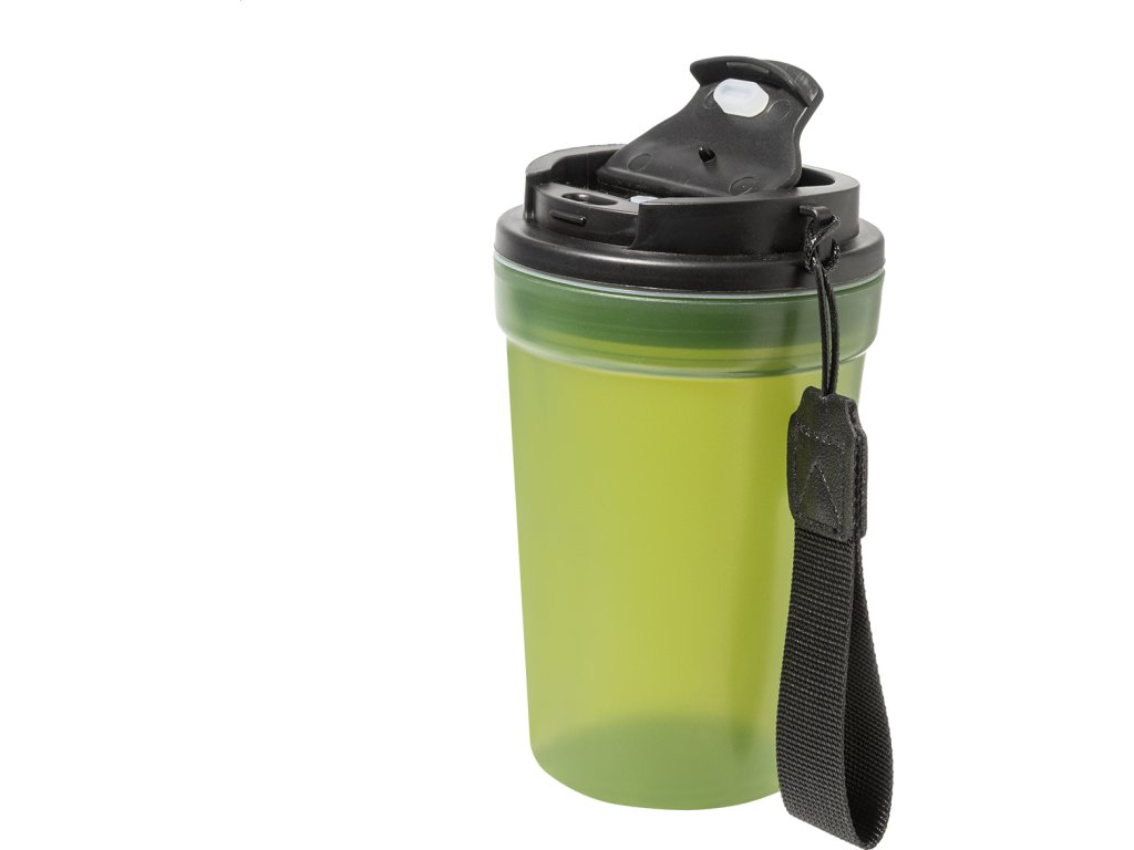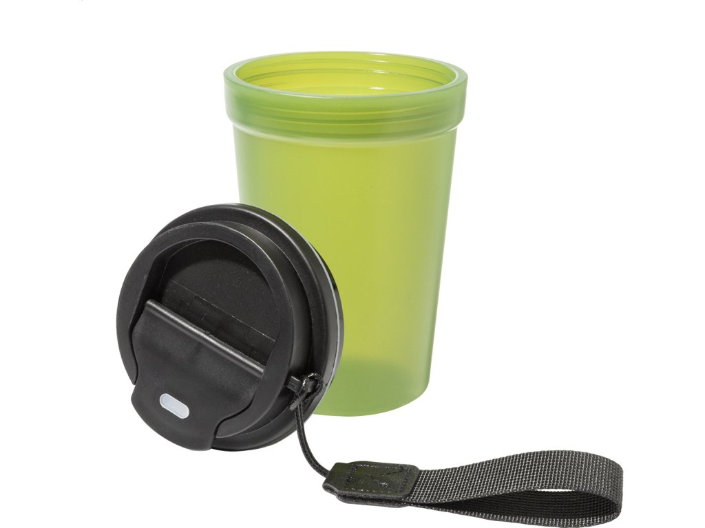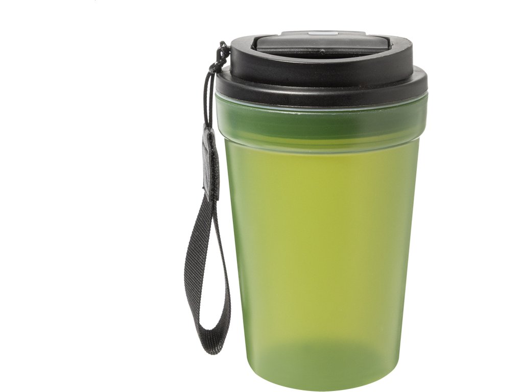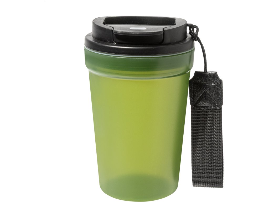 Jednostěnný cestovní kelímek z PP plastu s matnou povrchovou úpravou, víčkem na pití a poutkem z RPET polyesteru. 400 ml.