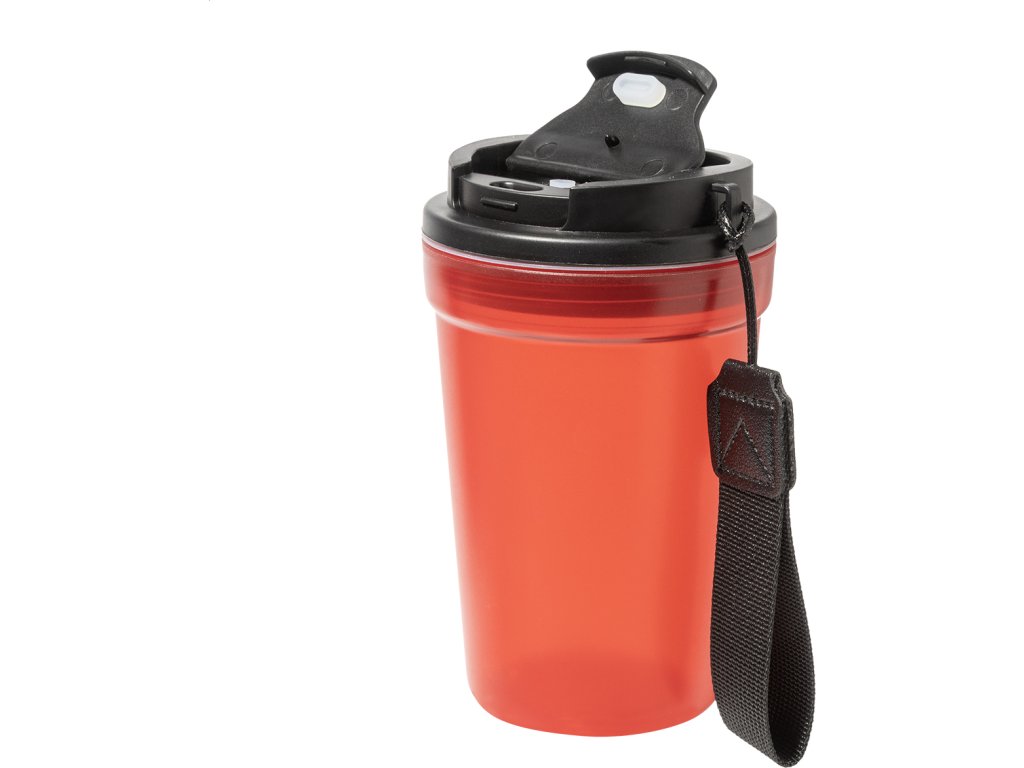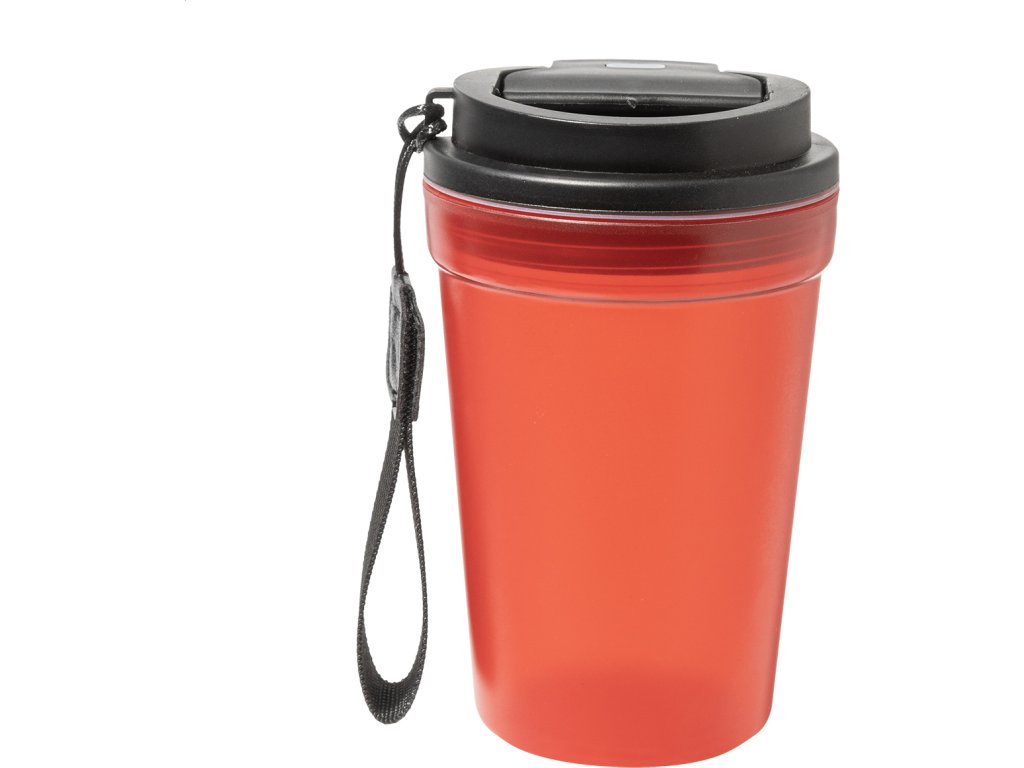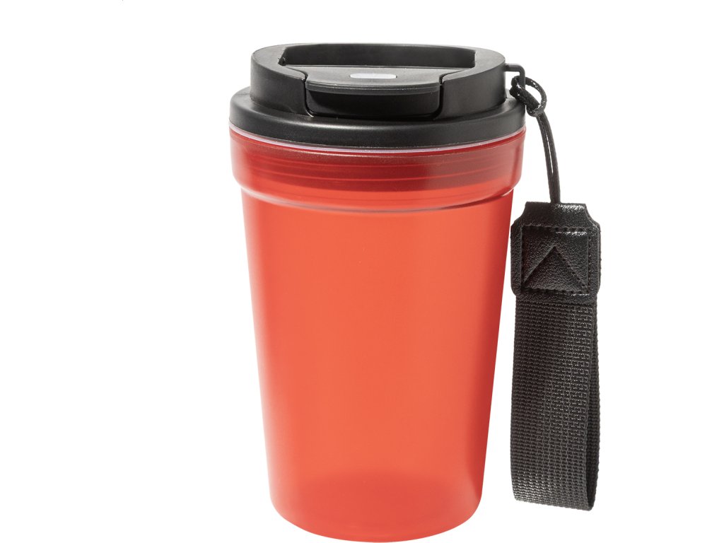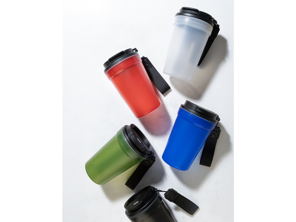 Jednostěnný cestovní kelímek z PP plastu s matnou povrchovou úpravou, víčkem na pití a poutkem z RPET polyesteru. 400 ml.