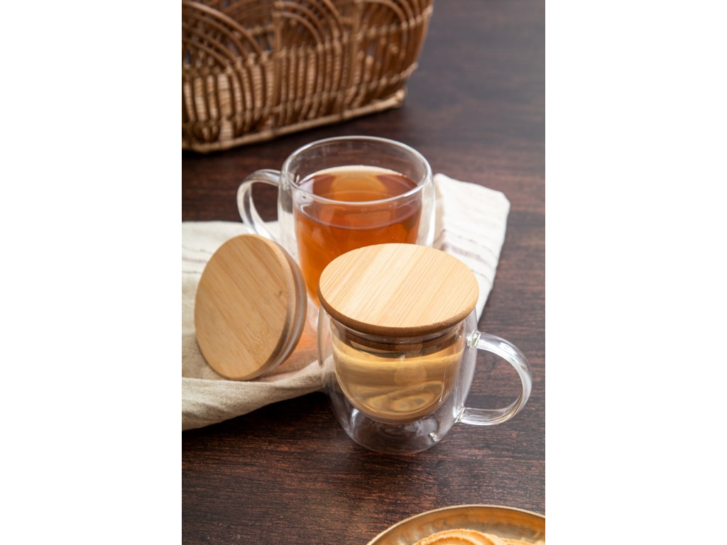 Dvoustěnný termo hrnek z borosilikátového skla s uchem a bambusovým víčkem, 250 ml. V kraftové papírové krabici.