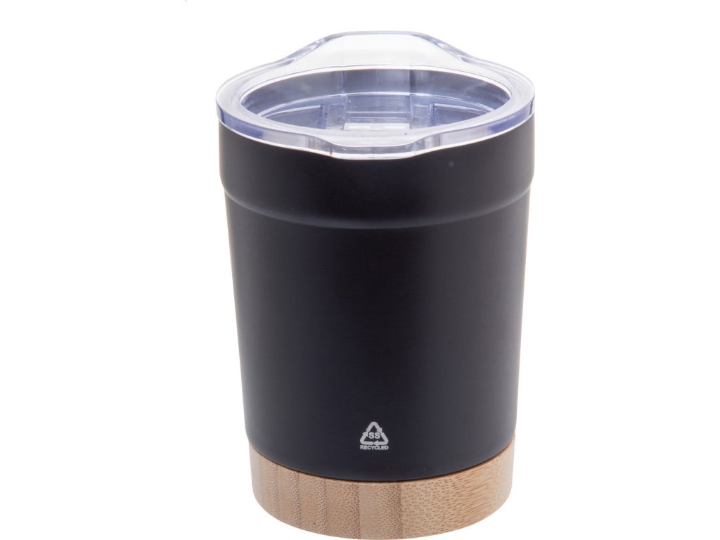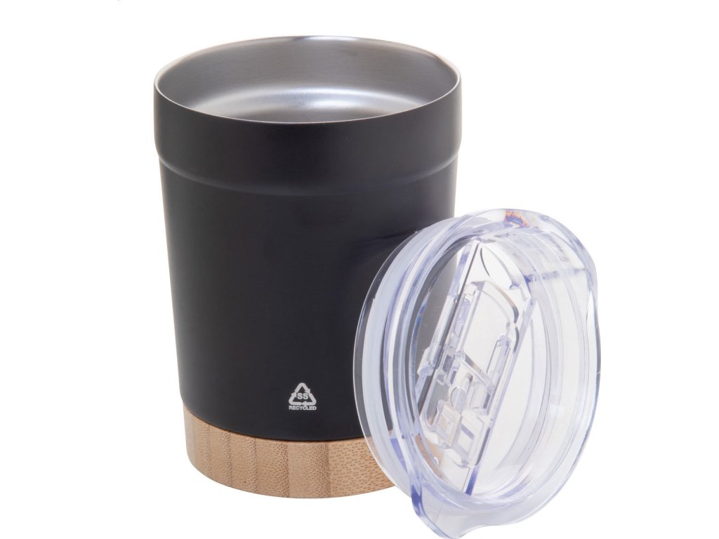 Dvoustěnný vakuově izolovaný termo hrnek z recyklované nerezové oceli s bambusovým dnem a AS plastovým víčkem na pití. 300 ml.