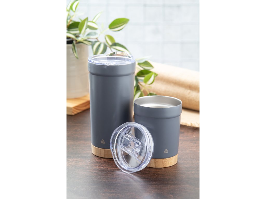 Dvoustěnný vakuově izolovaný termo hrnek z recyklované nerezové oceli s bambusovým dnem a AS plastovým víčkem na pití. 600 ml.