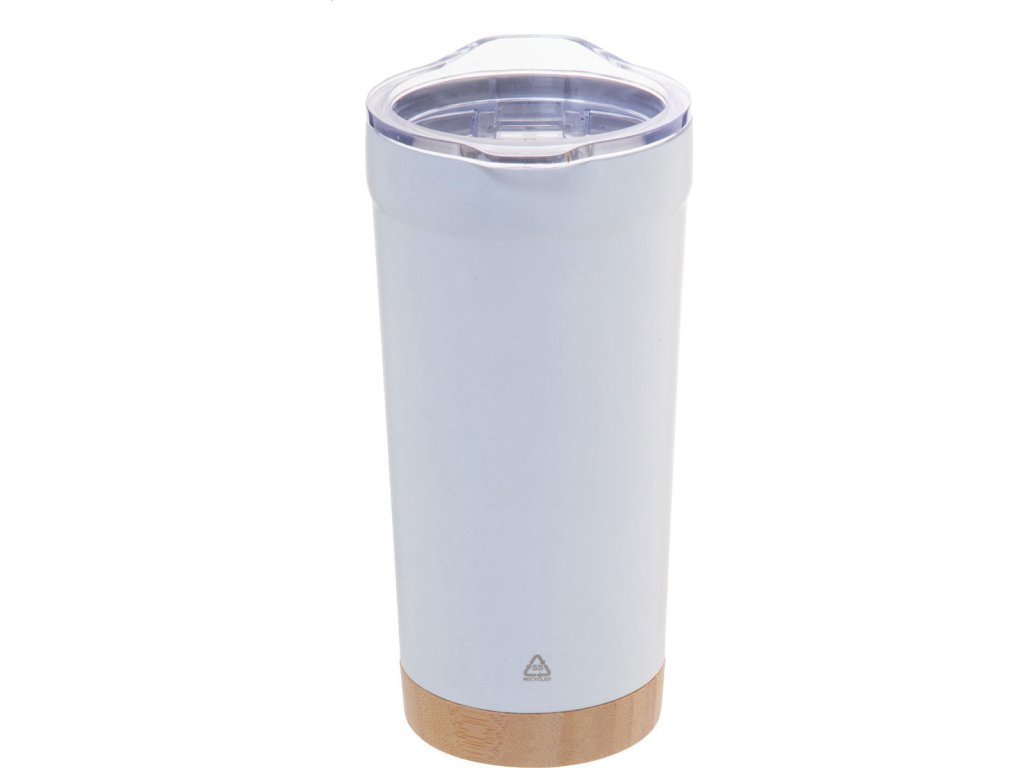 Dvoustěnný vakuově izolovaný termo hrnek z recyklované nerezové oceli s bambusovým dnem a AS plastovým víčkem na pití. 600 ml.