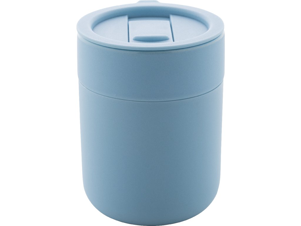 Silikonem potažený keramický cestovní kelímek s PP plastovým odkapávacím víčkem. 300 ml.