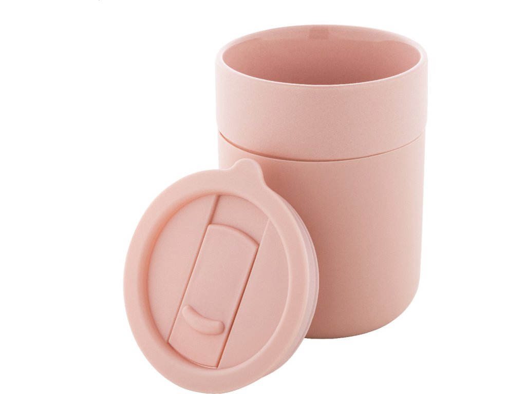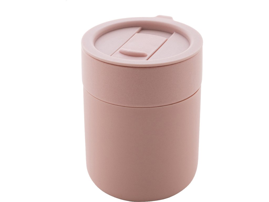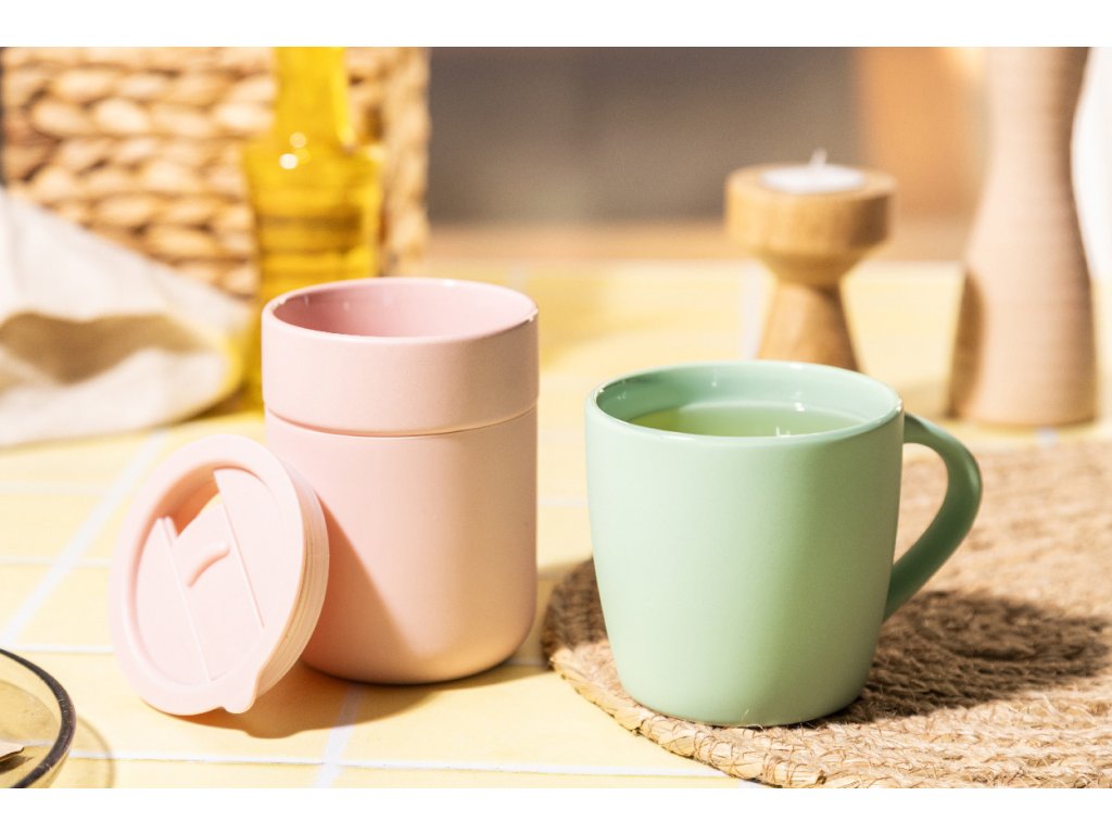 Keramický cestovní kelímek potažený silikonem s víčkem na pití z plastu PP. Objem 300 ml.