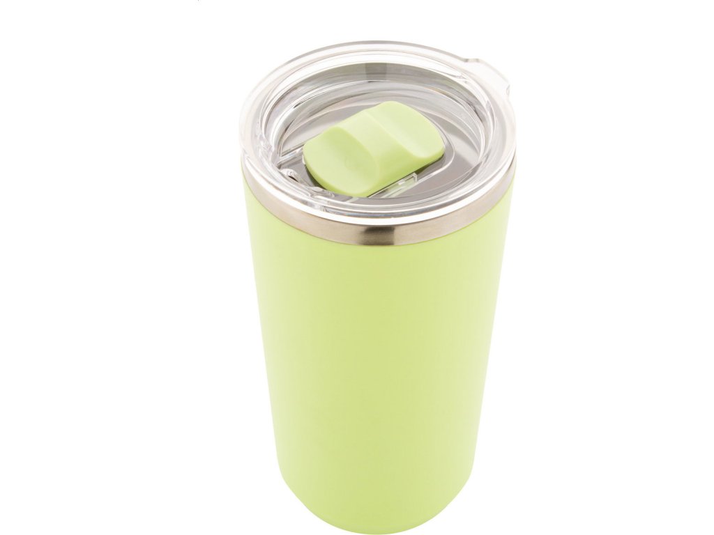 PP plastem pokrytý dvoustěnný, nerezový termo hrnek s víčkem na pití. 500 ml.