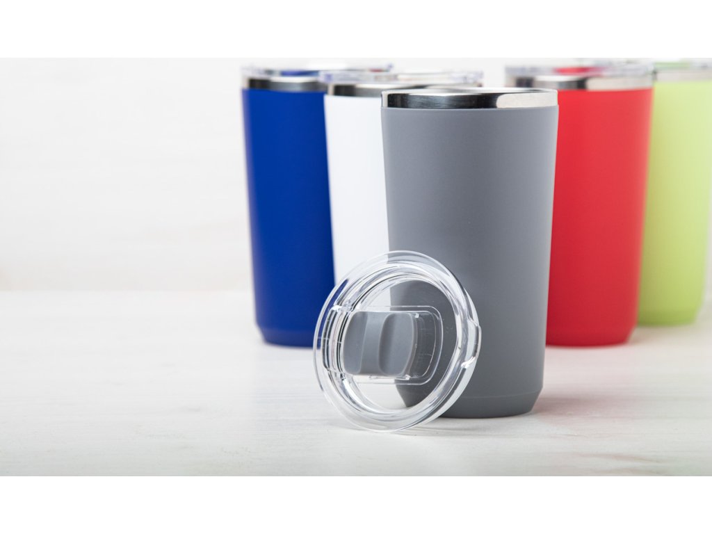 PP plastem pokrytý dvoustěnný, nerezový termo hrnek s víčkem na pití. 500 ml.