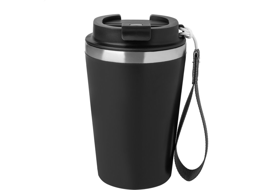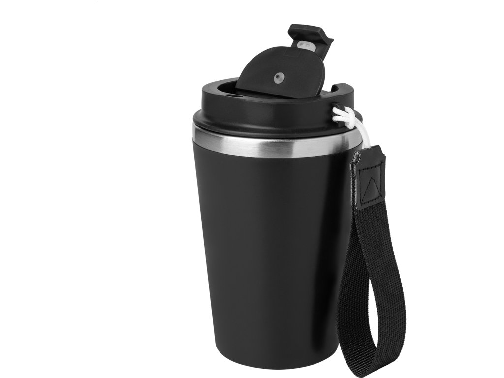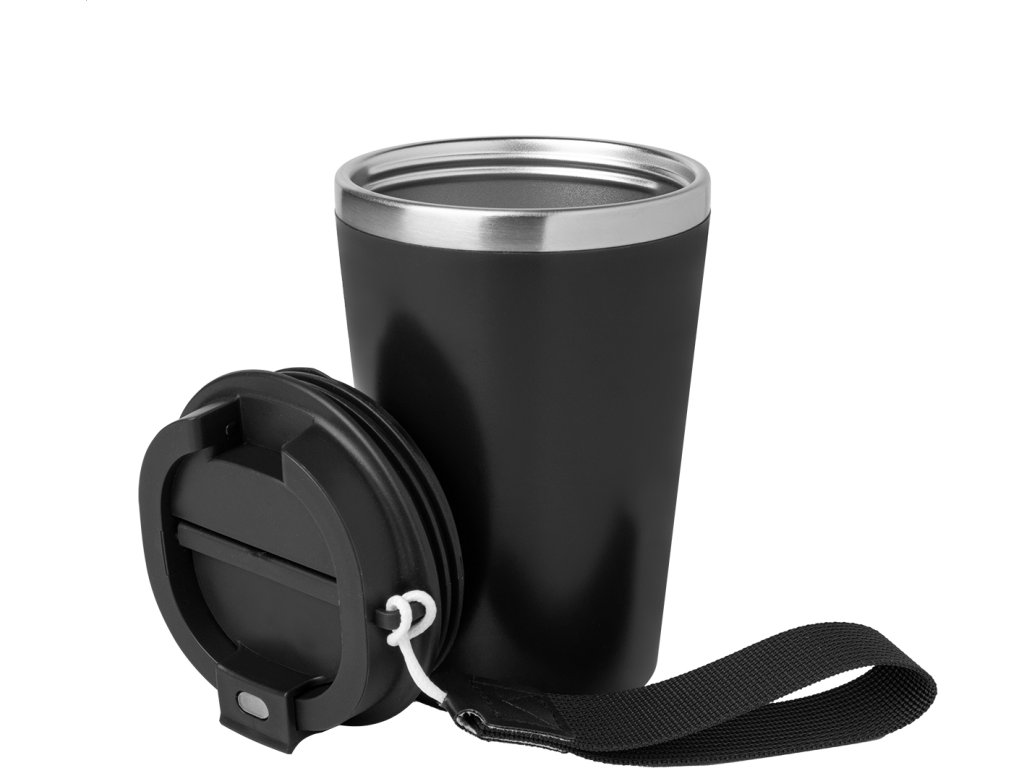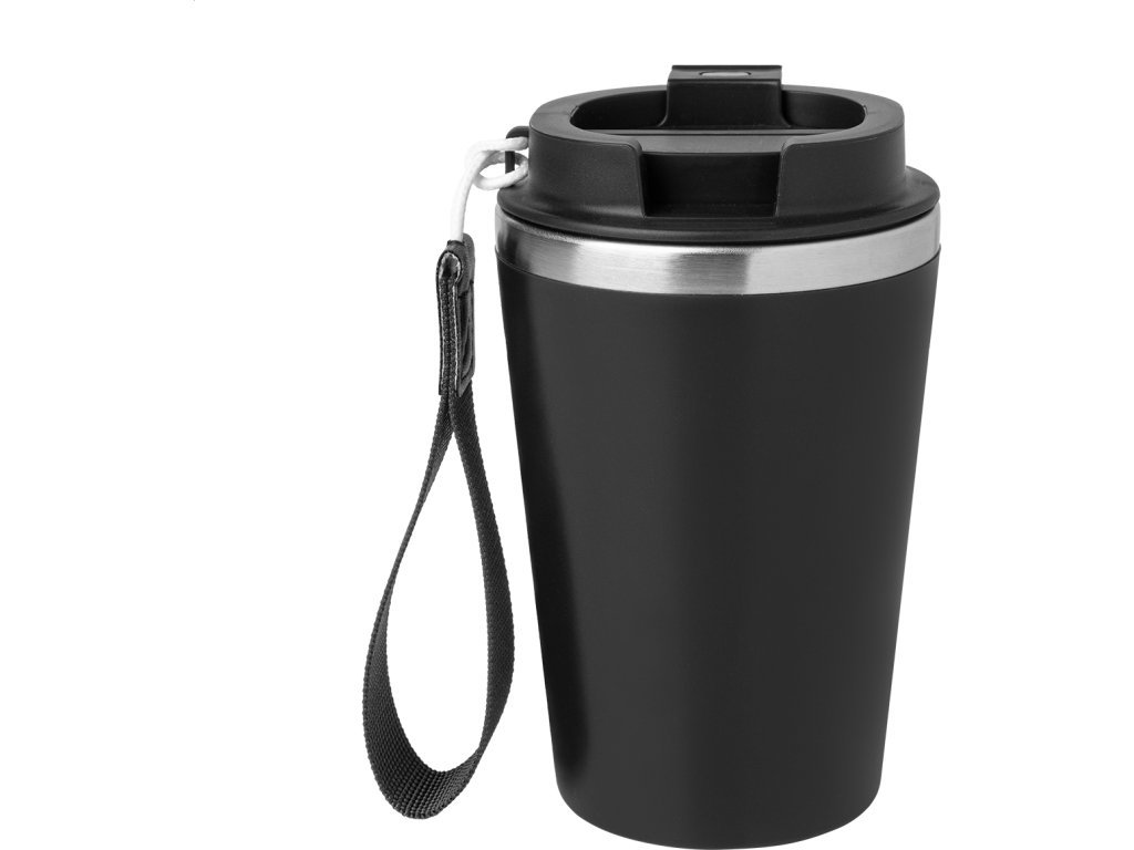 Dvoustěnný termo hrnek z recyklované nerezové oceli s vnějším PP plastem a víčkem na pití. S popruhem na přenášení RPET. 350 ml.