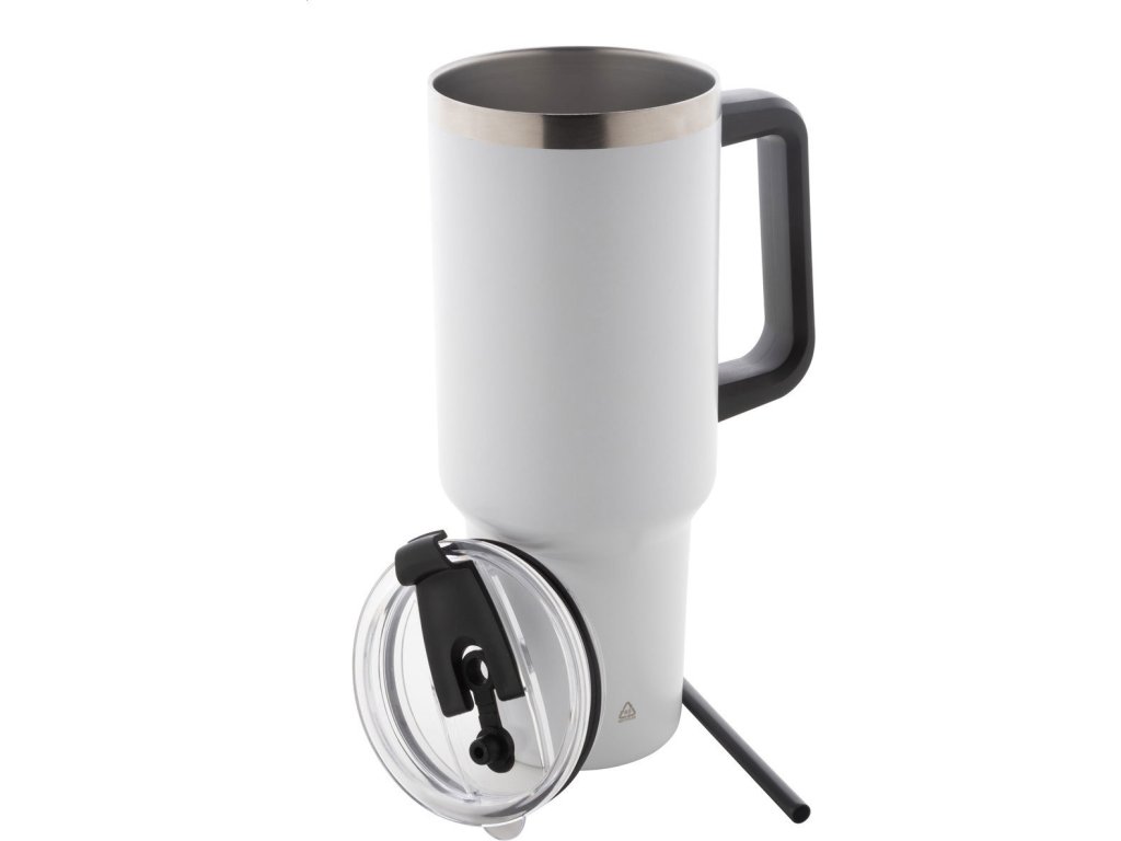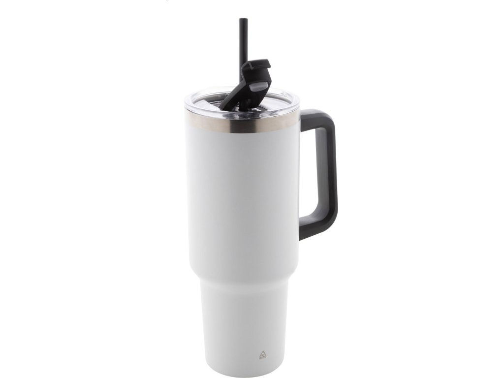 Dvouplášťový vakuově izolovaný termo hrnek z recyklované nerezové oceli s PS víčkem na pití a PP brčkem. 1200 ml.