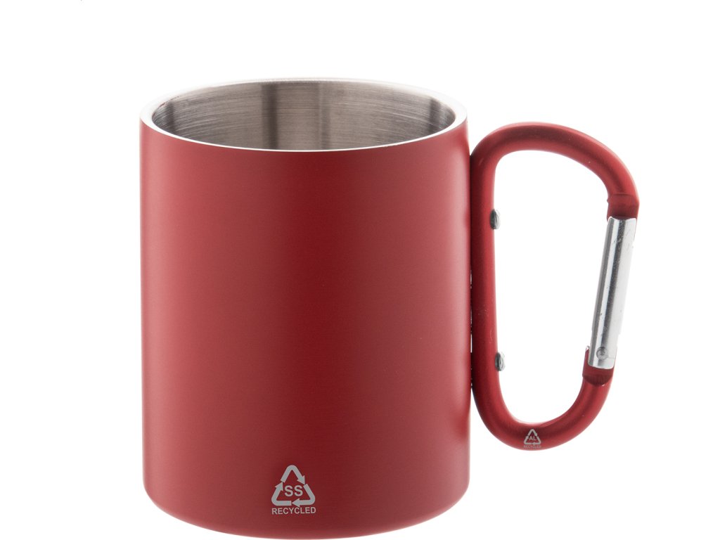 Dvoustěnný termo hrnek z recyklované nerezové oceli s karabinou z recyklovaného hliníku v odpovídající barvě. 300 ml. V kraftové papírové krabici.