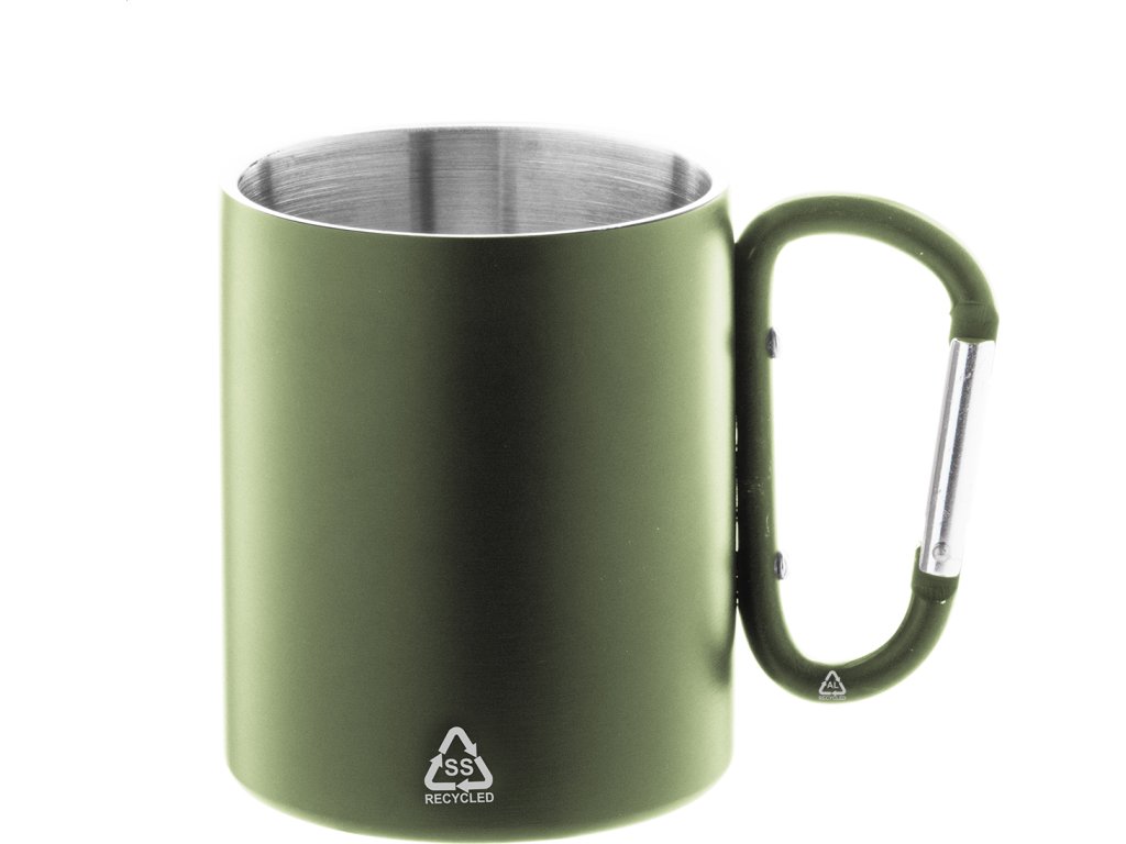 Dvoustěnný termo hrnek z recyklované nerezové oceli s karabinou z recyklovaného hliníku v odpovídající barvě. 300 ml. V kraftové papírové krabici.